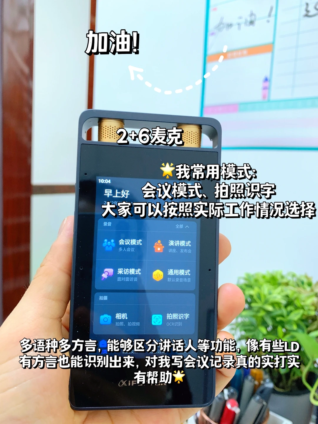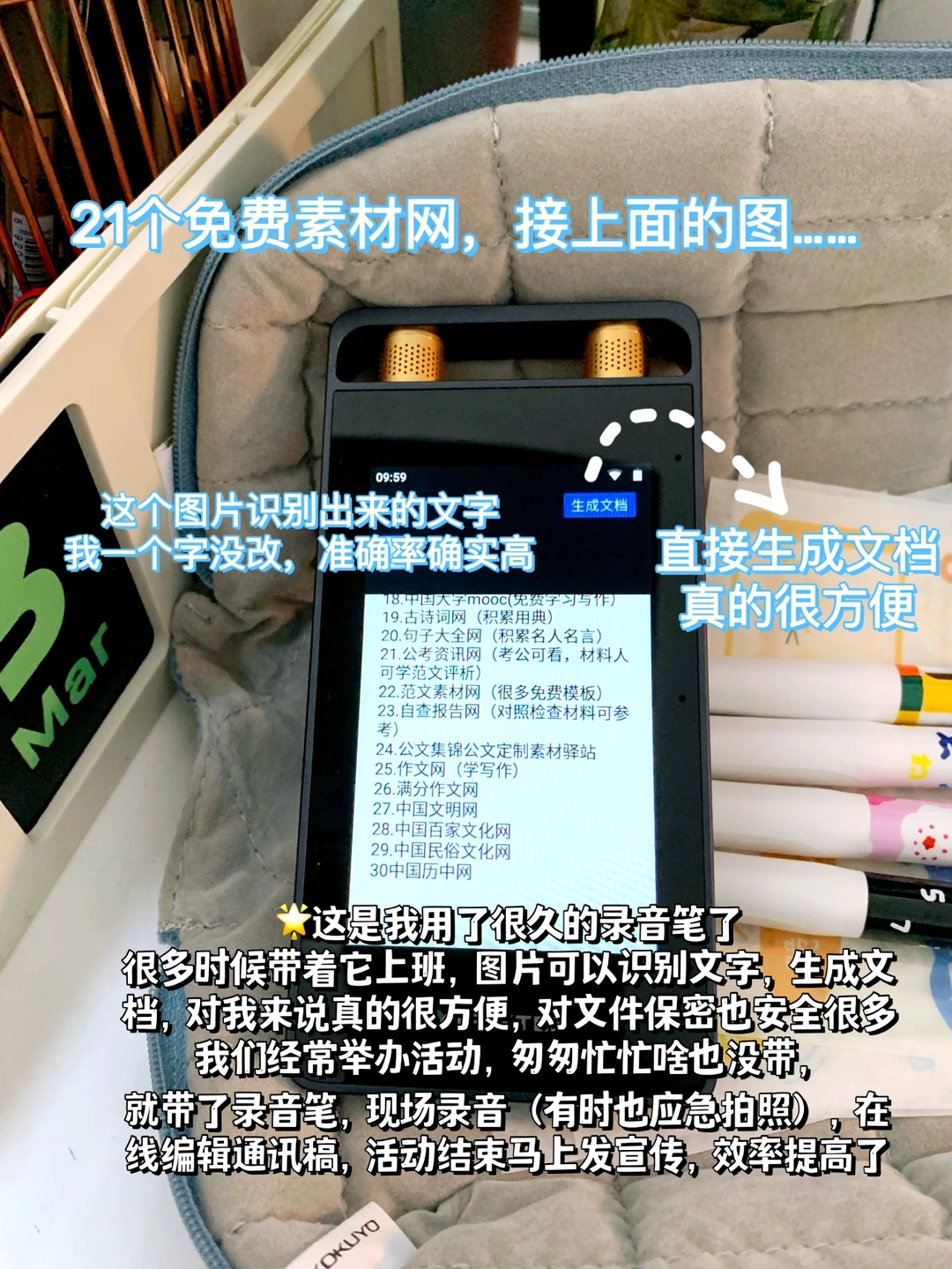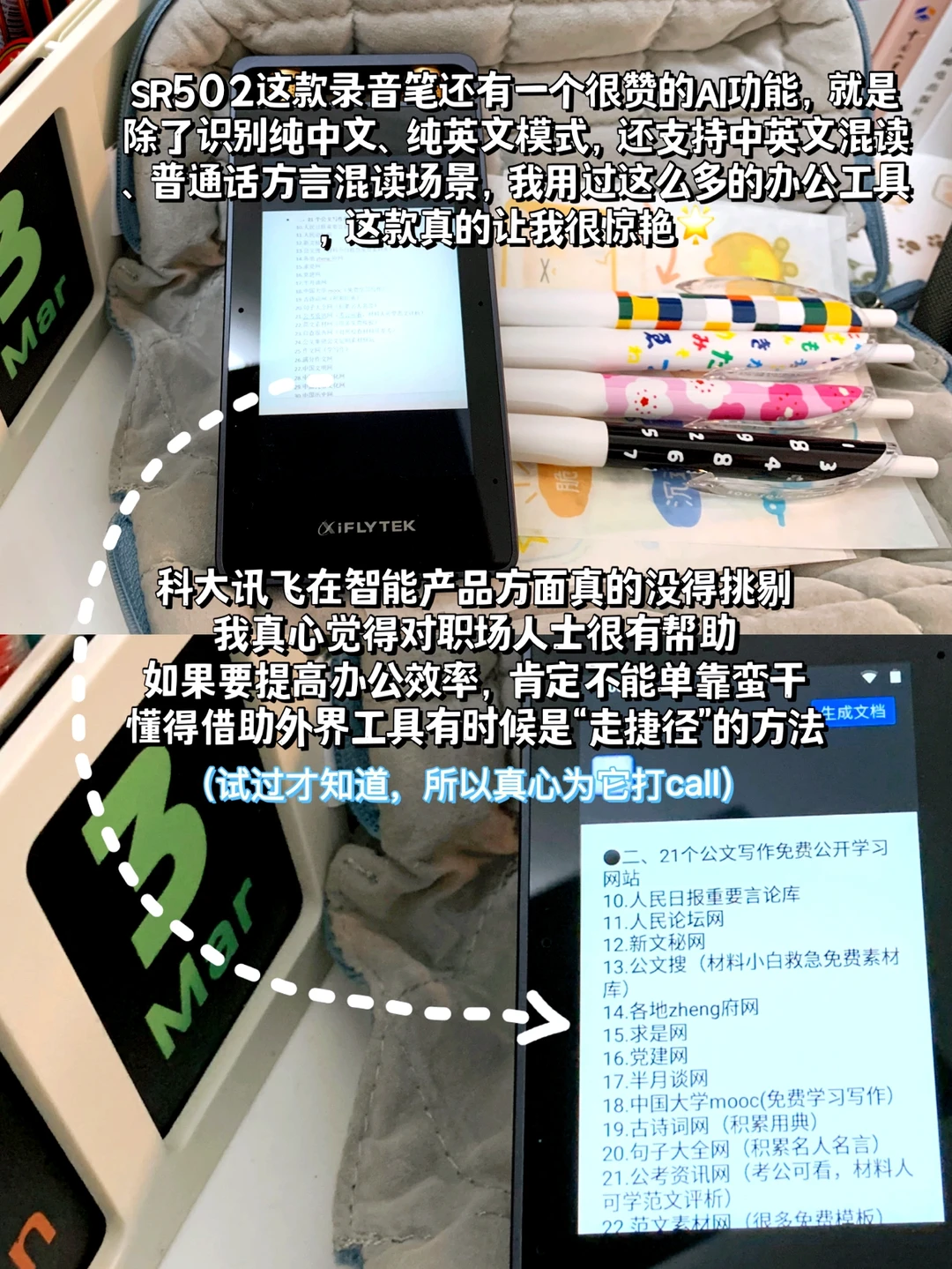 真心建议所有职场人都配备,特别是材料人❗️我愿称它为办公和效率神器!科大讯飞SR系列业内评价超好,超多AI功能,我这款录音笔自从我成为专职材料人就用上了,写会议纪要不要太香,不用反复听录音听得耳朵发疼,可以直接转换文字(我领导们普通话带点方言不算标准,但转换无压力,准确率贼高)。举办活动要写通讯稿,我会把它放在口袋,最远收音距离有15米,领导讲话的时候就录起来,活动结束通讯稿也能实时完成,马上发宣传,提高效率杠杠的