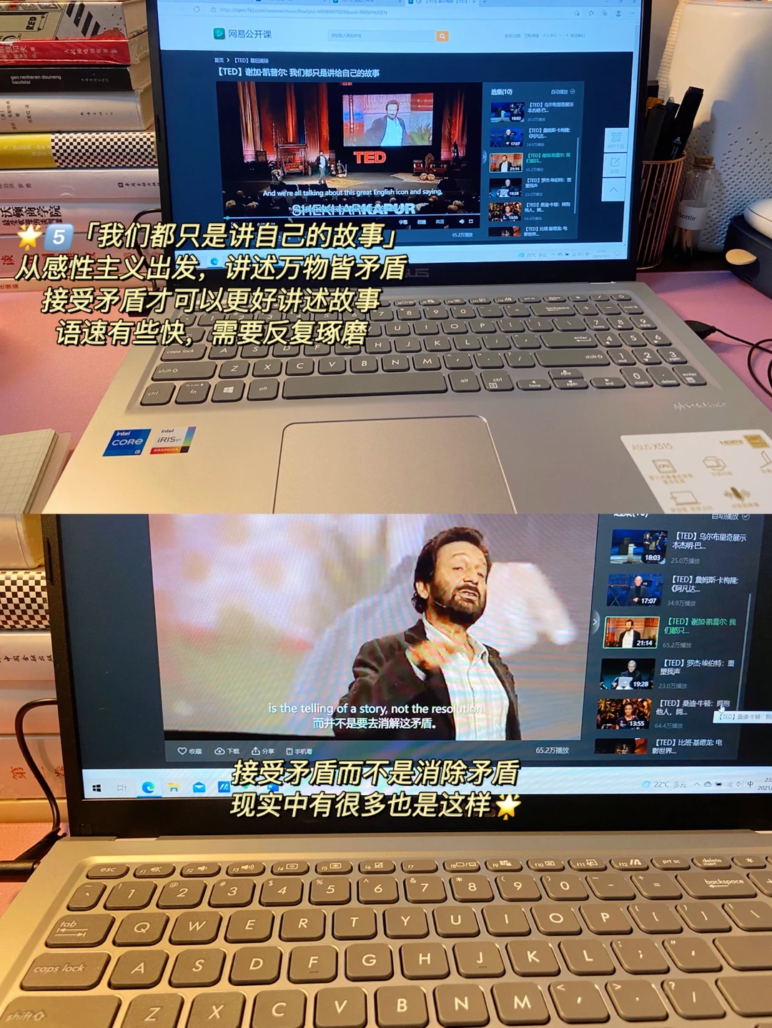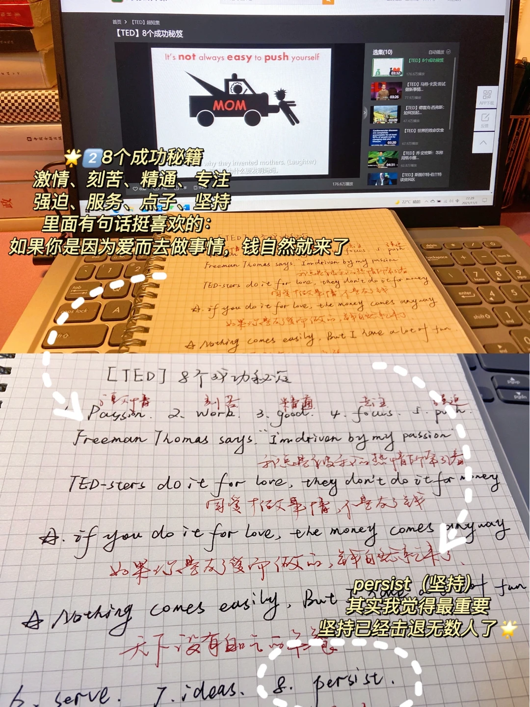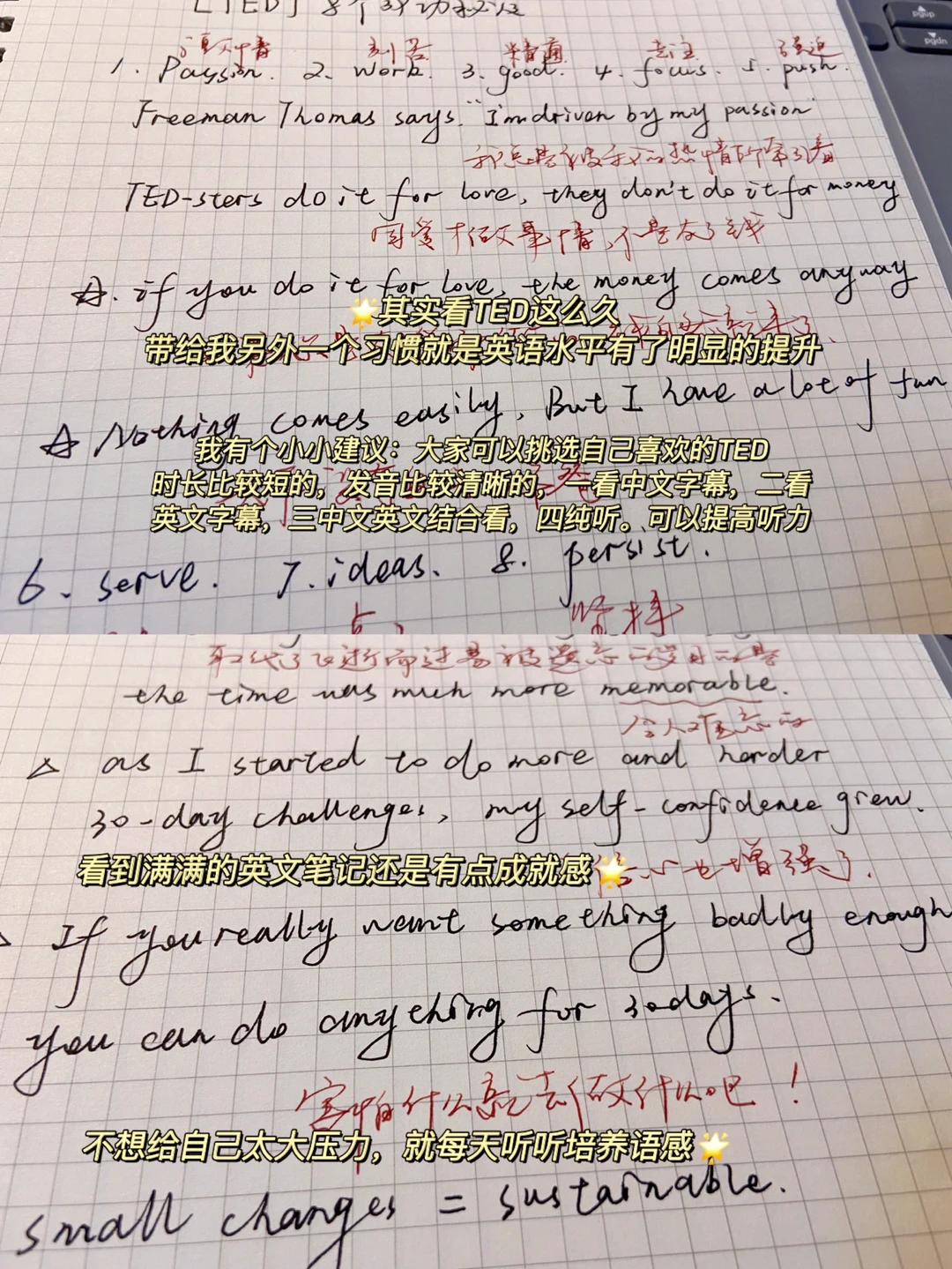 2.每周大概看2集TED视频,先看1遍中文字幕,再看1遍英文字幕,然后中英文字幕再一起看,最后1遍不看字幕纯听音频,看看脑海中能不能浮现英文句子。
