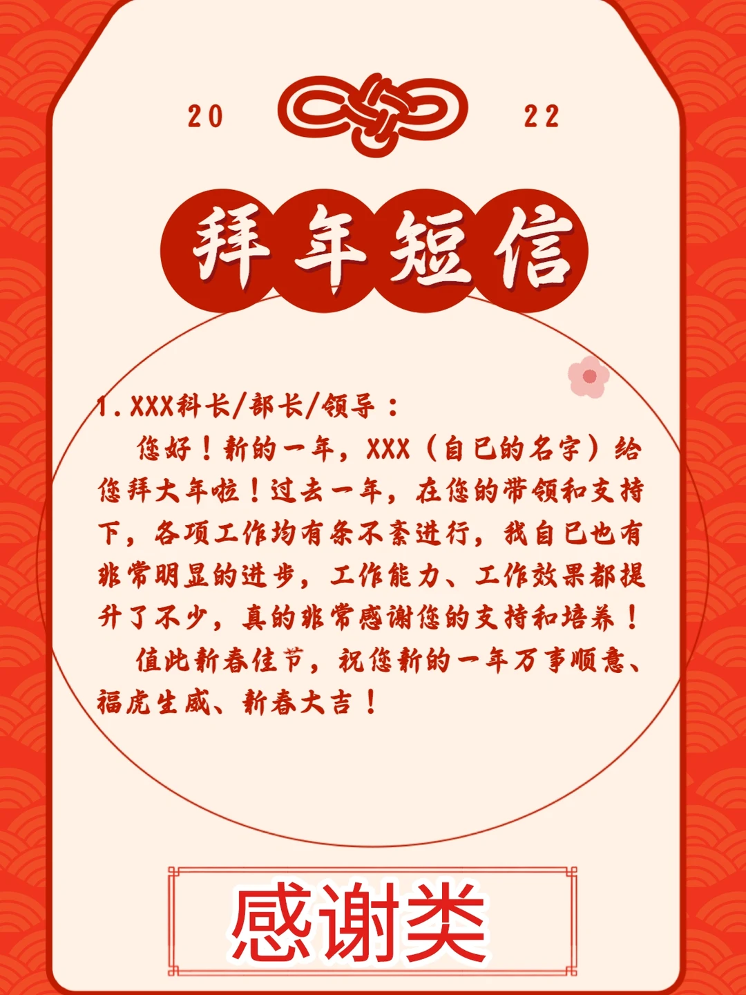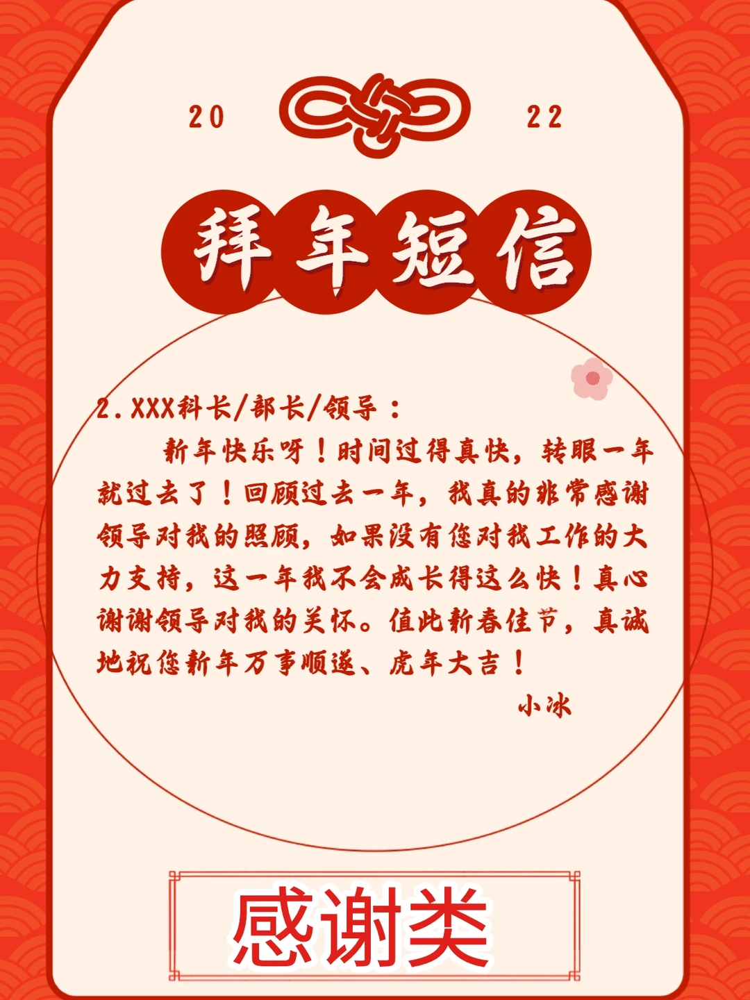 新年快乐呀!时间过得真快,转眼一年就过去了!回顾过去一年,我真的非常感谢领导对我的照顾,如果没有您对我工作的大力支持,这一年我不会成长得这么快!真心谢谢领导对我的关怀。值此新春佳节,真诚地祝您新年万事顺遂、虎年大吉!
