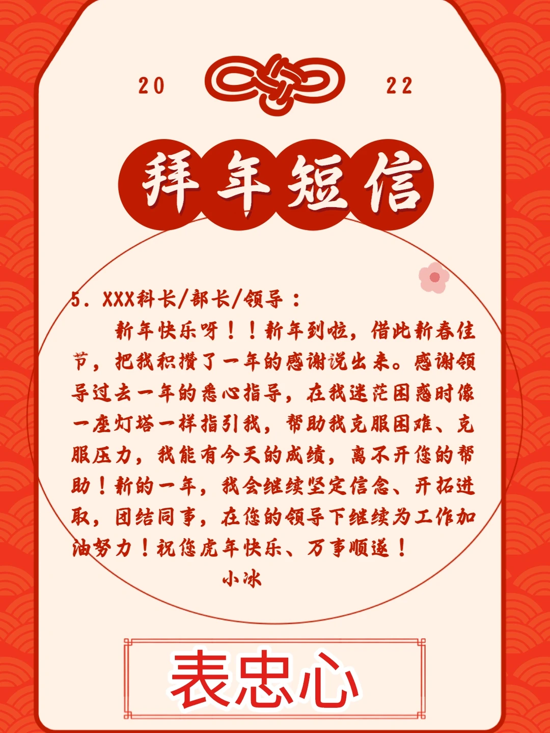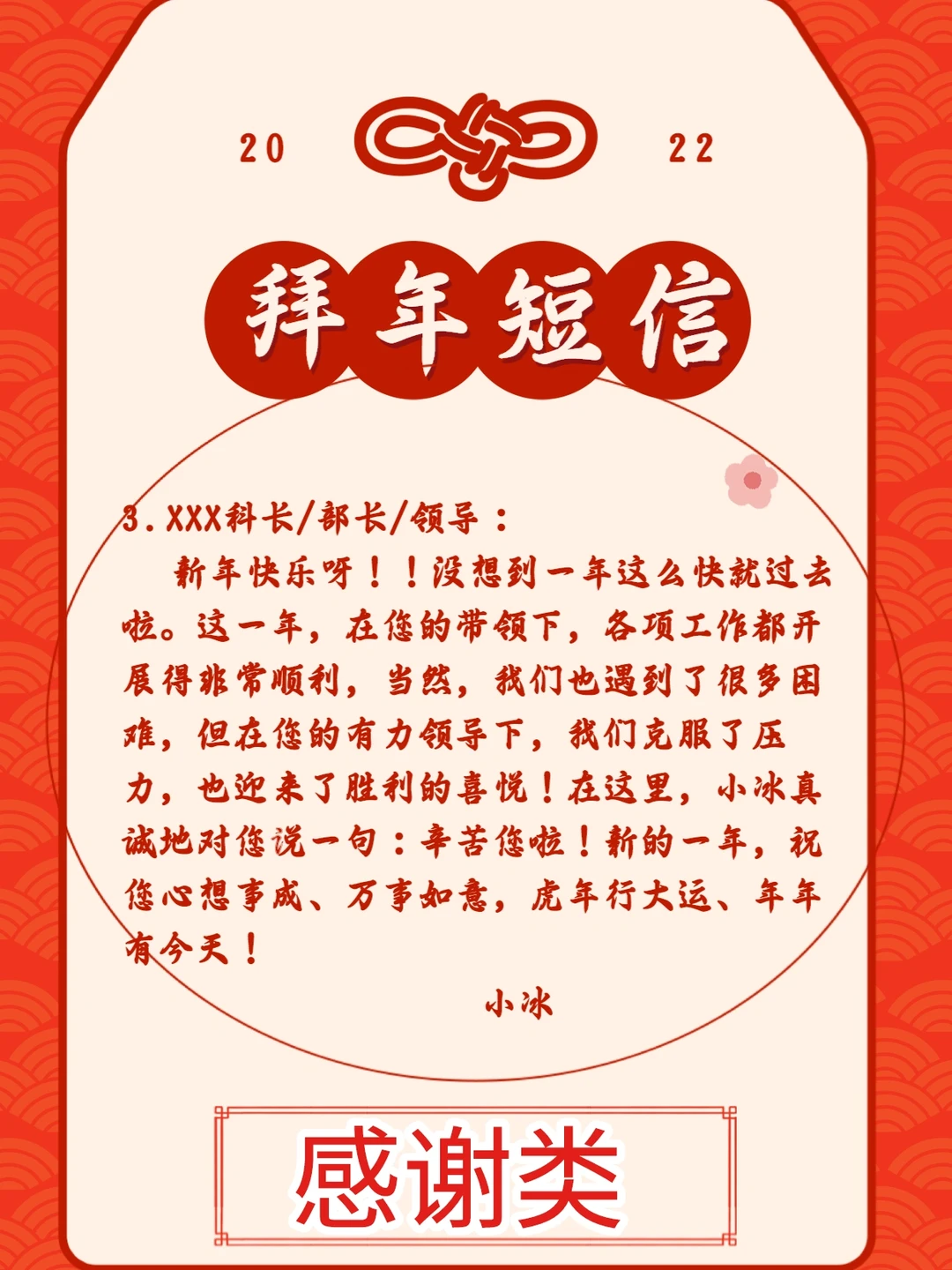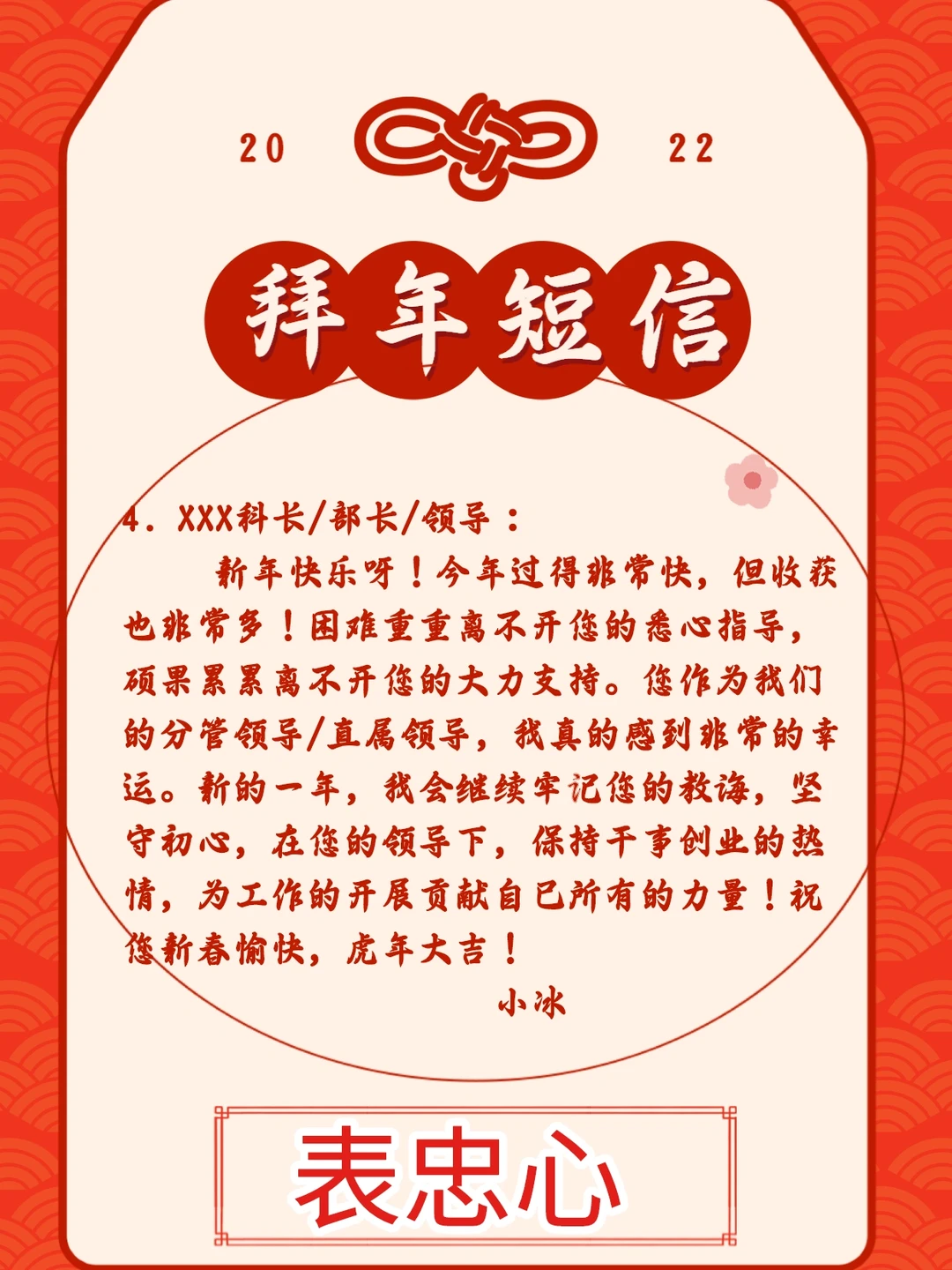 新年快乐呀!今年过得非常快,但收获也非常多!困难重重离不开您的悉心指导,硕果累累离不开您的大力支持。您作为我们的分管领导/直属领导,我真的感到非常的幸运。新的一年,我会继续牢记您的教诲,坚守初心,在您的领导下,保持干事创业的热情,为工作的开展贡献自己所有的力量!祝您新春愉快,虎年大吉!