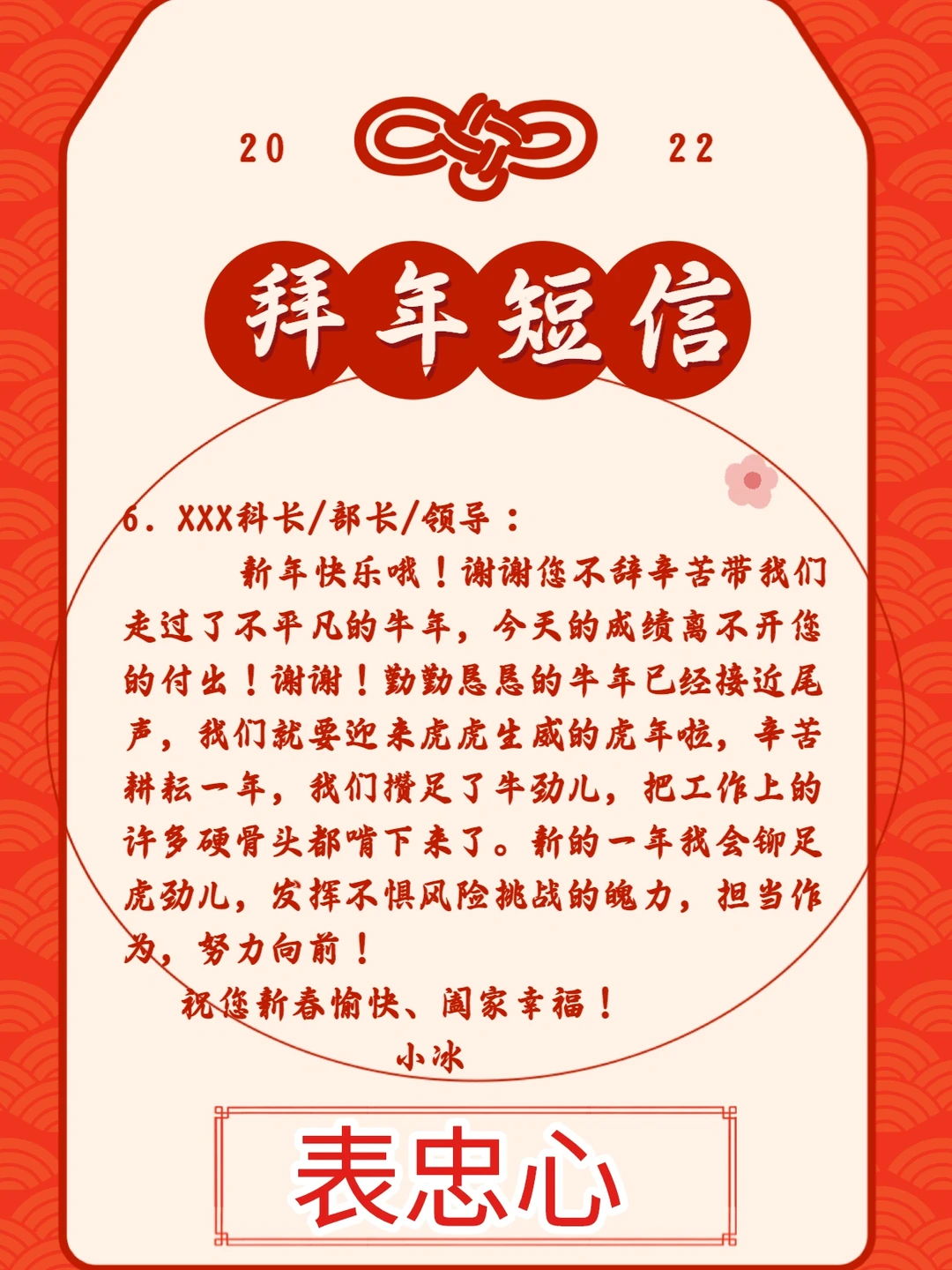 新年快乐呀!!没想到一年这么快就过去啦。这一年,在您的带领下,各项工作都开展得非常顺利,当然,我们也遇到了很多困难,但在您的有力领导下,我们克服了压力,也迎来了胜利的喜悦!在这里,小冰真诚地对您说一句:辛苦您啦!新的一年,祝您心想事成、万事如意,虎年行大运、年年有今天!