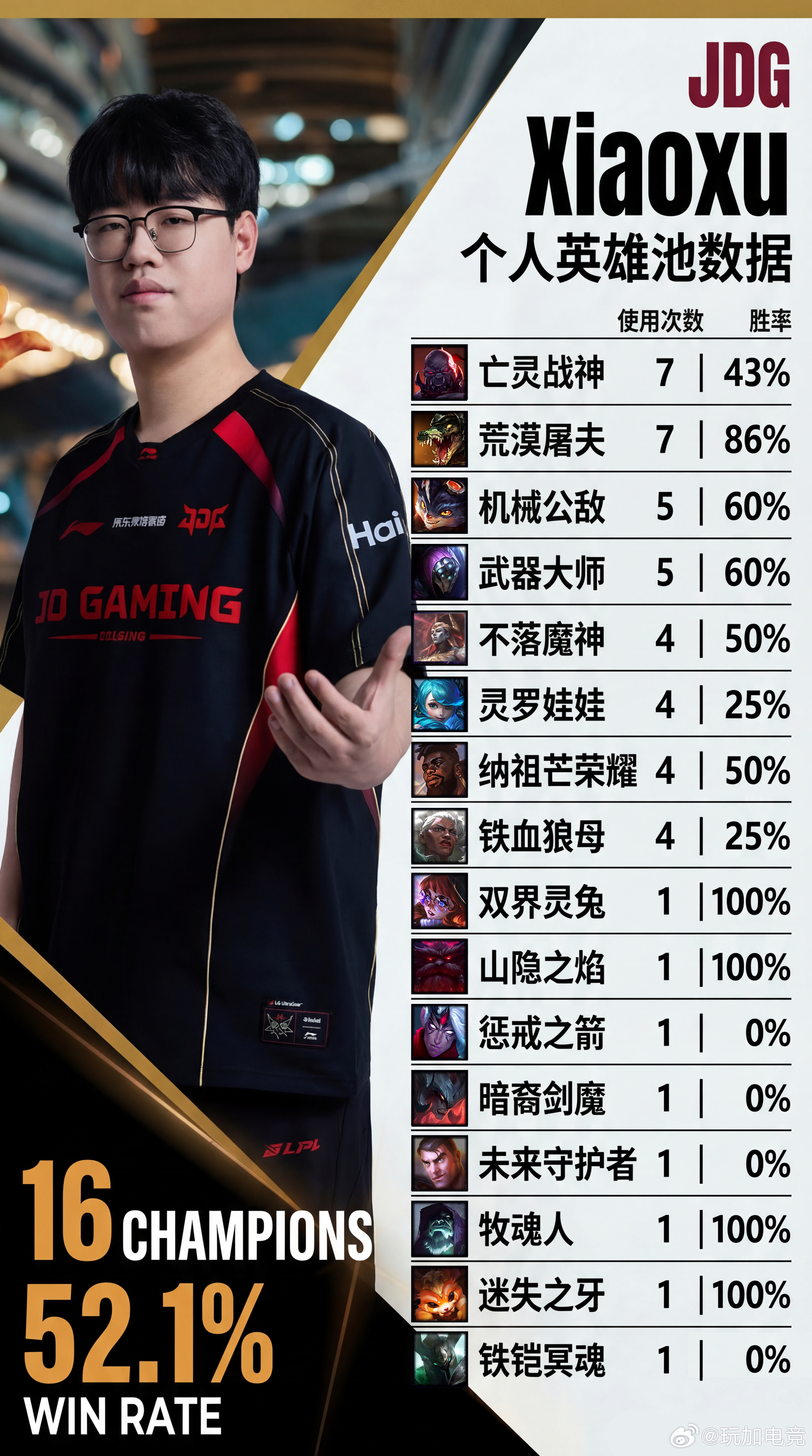 JDG Xiaoxu 16个英雄,选用最多英雄为赛恩和鳄鱼(7次),胜率43%、86%