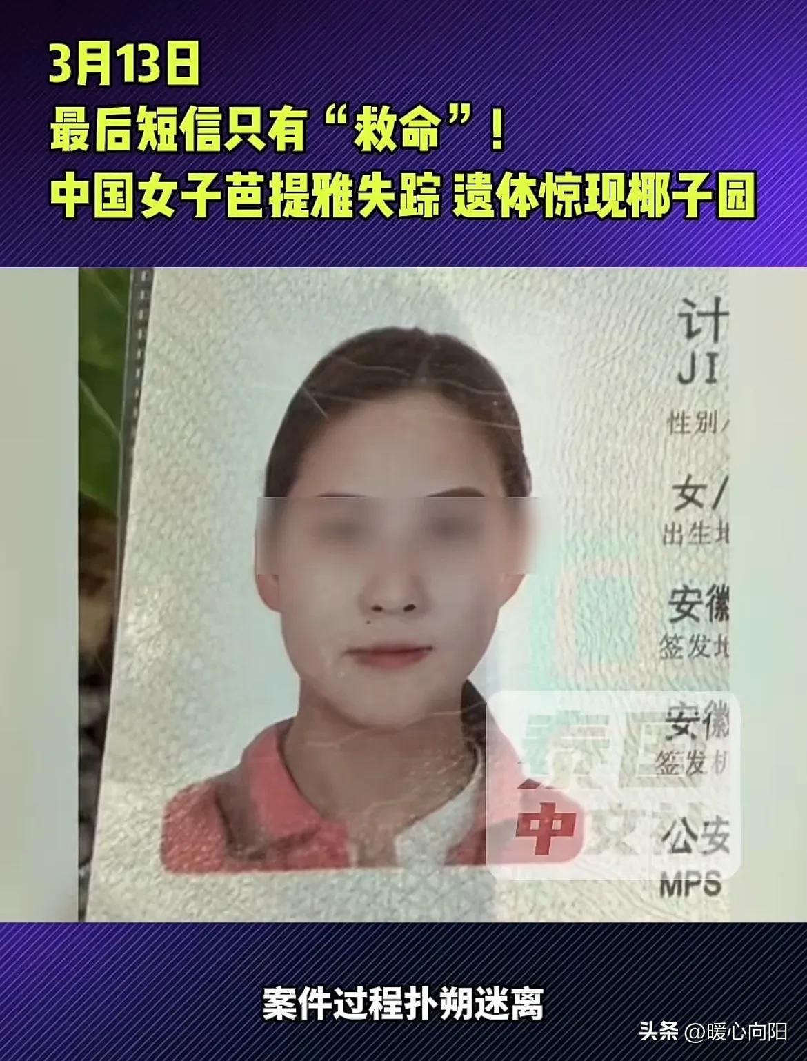 安徽一女子在泰国芭提雅遇害!最后向朋友发出一条救命信息,多天以后在二三百公里以外的椰子园里发现女子的遗体! 这名女子姓纪34岁,在泰国芭提雅的娱乐场所工作,2月20日晚上她接到一个电话,要求她到芭提雅娱乐场所陪同,她一看屋内有多名中国男子,于是放忪警惕,觉得都是中国人,很安全。 监控画面显示,刚开始女子陪客人一起吃饭,一起聊天,有说有笑,行动正常,后来一名中国男子带她走出了娱乐场所,当时女子已处于昏迷状态,被男子搀扶上车后离开现场。 2月21日早上女子给朋友发了一条救命短信,从此失联了。于是朋友选择报警。 多天以后,当地一位村民在椰子园傍边的水沟中发现一具女性遗体,经身份比对,证明死者正是以前失踪的纪某。 目前,警方己锁定当晚带她走的那位中国男子。现在纪某的男朋友赶到泰国,协助警方办案,要求查明真相。 这件事太让人心痛了,同胞本是一家亲,可是为什么要伤害同胞?