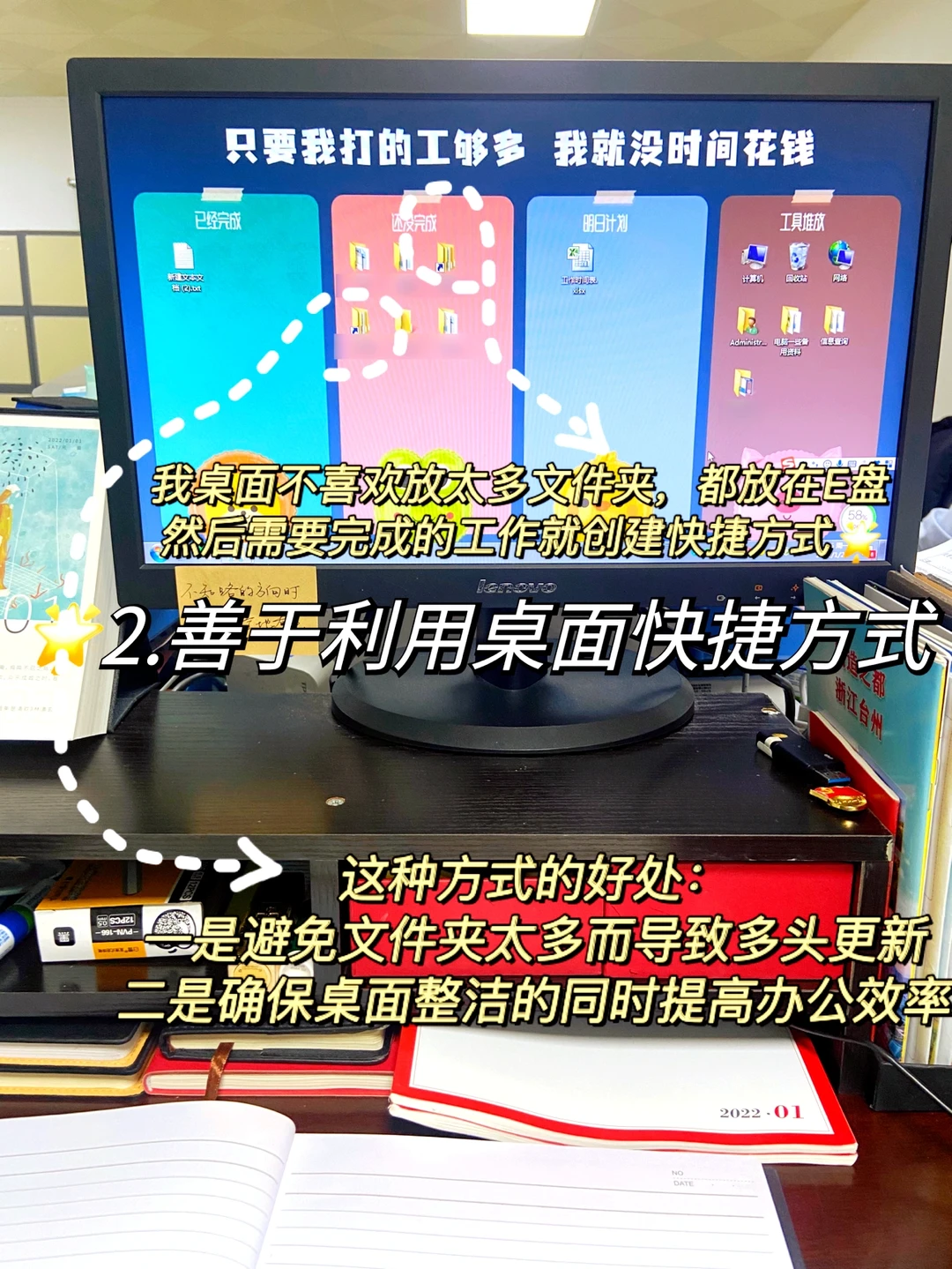我桌面不喜欢放太多文件夹,一般都是放在E盘里,然后需要完成的工作就创建桌面快捷方式。这种方式的好处:一是避免文件夹太多而导致表格等文件多头更新;二是确保桌面整洁的同时能够大大提高办公效率。