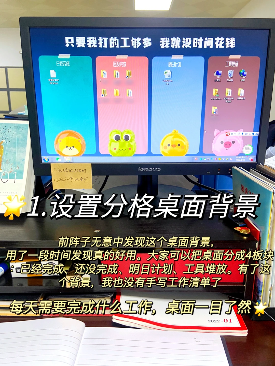 前阵子无意中发现这个桌面背景,用了一段时间发现真心好用。大家可以按照工作实际情况,把桌面分成4个板块:已经完成、还没完成、明日计划、工具堆放,然后日常工作就放在对应板块。我现在已经没有手写每日工作清单了,电脑桌面已经一目了然。