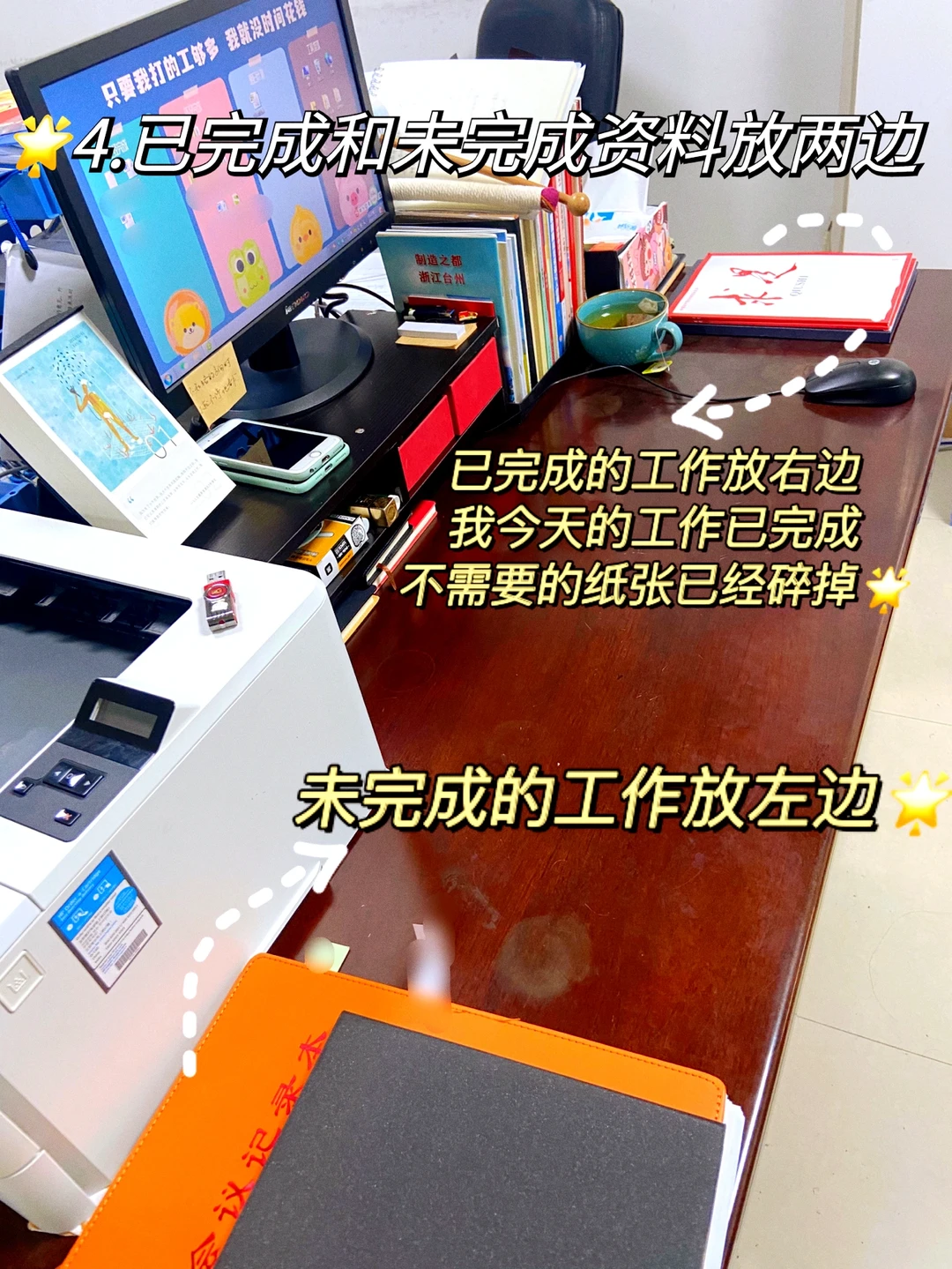 不知道大家有没有合理布局你的办公桌面,一般我习惯将未完成的工作资料放在左边,已完成的资料放在右边,这样形成习惯以后,能够大大节约办公时间。还有温馨提示:一些不必要的文件记得及时用碎纸机碎掉。