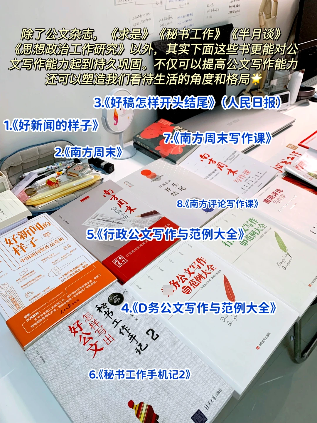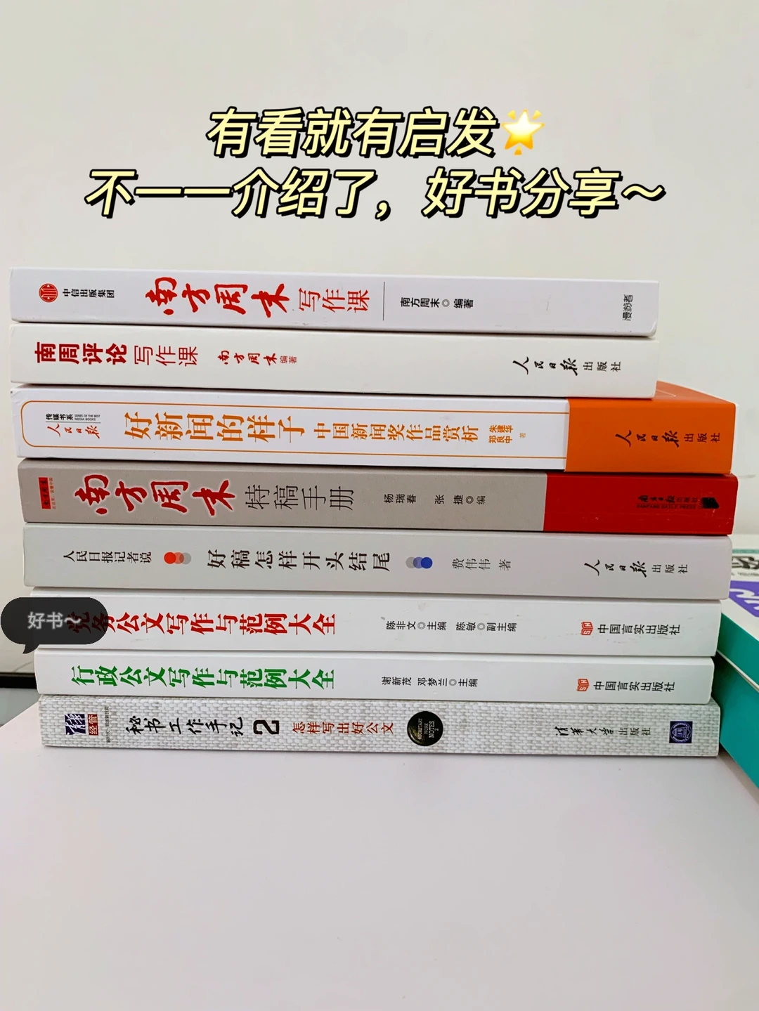 🔥这上面8本书,我觉得真的对公文小白太有帮助! 把写作变成人生通用技能吧,不仅学公文,也学习更多的写作技巧,拓宽人生道路!学起来🌟🌟 1️⃣《好新闻的样子》 2️⃣《南方周末》 3️⃣《好稿怎样开头结尾》人民日报编写 4️⃣《D务公文写作范例大全》 5️⃣《行政公文写作范例大全》 6️⃣《秘书工作手记2》 7️⃣《南方周末写作课》 8️⃣《南方评论写作课》