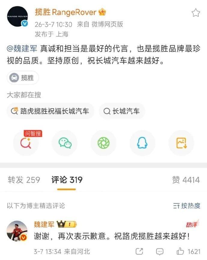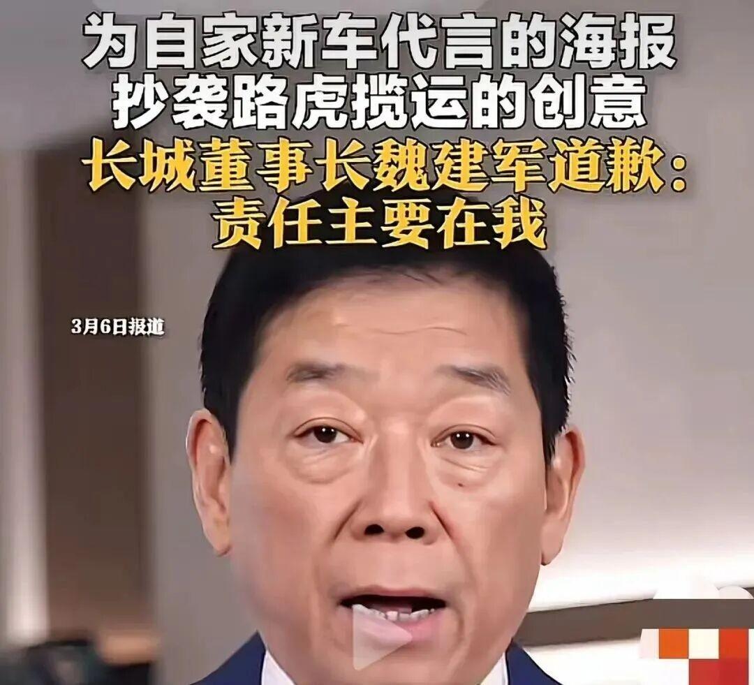 长城汽车董事长魏建军,为一幅海报的抄袭道歉。 3月5日,他刚成为自家旗舰SUV的代言人。 设计师就站出来,指出那海报和路虎揽胜运动版的宣传图“像素级相似”。 构图、人物姿势、红黑渐变背景,几乎一模一样。 内部核查后,魏建军录了视频。 他说:“海报的确抄袭了,不能有任何辩解。” 他说自己“审核把关不严”。 他承诺承担全部法律和经济后果。 路虎揽胜的官微只回了一句话:“坚持原创,祝长城汽车越来越好。” 魏建军又追着回复了一次,再次道歉。 一家年营收千亿的车企老板,亲自为一幅海报的像素点鞠躬。 这画面本身就够荒诞的。 那负责设计、审核这幅海报的人呢? 他们是不是早就习惯了“抄了再说”,反正天塌下来有高个子顶着? 我们总以为道歉是犯错后的补救。 可当道歉成了流程里最高规格的表演,恰恰说明底线早就被踩在了脚下。 “没被抓到”是常态,“抓到了再说”是预案。 直到某天,钢丝断了,站在最前面的人被迫“立正挨打”。 会议室里一片寂静。 你站起来说:“是我的问题,数据确实抄了,我重新做。” 那一刻你才明白,那句“我错了”之所以沉重,不是因为它难说出口。 而是因为在此之前,有太多人默认了那条通往错误的捷径。