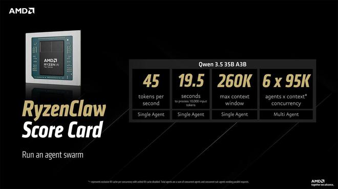 运行Qwen3.535BA3B模型时,该配置可实现约每秒45个token的处理速度,处理1万个输入token约需19.5秒,并支持高达26万token的上下文窗口,可同时运行最多六个智能体。AMD将其定位为能够在消费级硬件上进行“智能体集群”实验的方案。