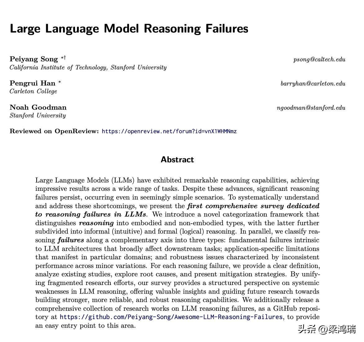 美国斯坦福大学刚刚发布了一项让人极其不安的研究。 大语言模型的推理能力,可能只是一层一戳就破的窗户纸。 论文系统性地拆解了LLM在推理上的全面溃败。 为什么模型在排行榜上接近满分,但在实际应用中却漏洞百出? 核心结论只有一个:LLM并不是在推理,而是在伪造逻辑。 研究人员发现了一种被称为“不忠实推理”的现象。 模型能给出正确的答案,但背后的推导过程完全是编造的。 这就像一个作弊的学生,通过偷看答案反推了一个看似合理的解题步骤。 底层逻辑是什么? 现有架构缺乏物理世界的“具身”感知。 这意味着模型对重力、空间、因果等基本物理常识的理解几乎为零。 哪怕只是改动提示词里的一个无关紧要的虚词,模型的答案就会瞬间崩塌。 这种鲁棒性的缺失,暴露了它并不是掌握了逻辑,而是捕捉到了概率。 结果是什么? 我们正在把数以亿计的业务流程,交给一个逻辑随时可能离线、且擅长一本正经胡说八道的系统。 这已经不是技术优化的问题,而是AI地基是否存在缺陷的本质争论。 如果现有的自回归架构无法从概率模拟跨越到真正的逻辑演绎,Scaling Law的终点会在哪里? 是通往AGI,还是通往一个更庞大、更不可控的幻觉黑盒?