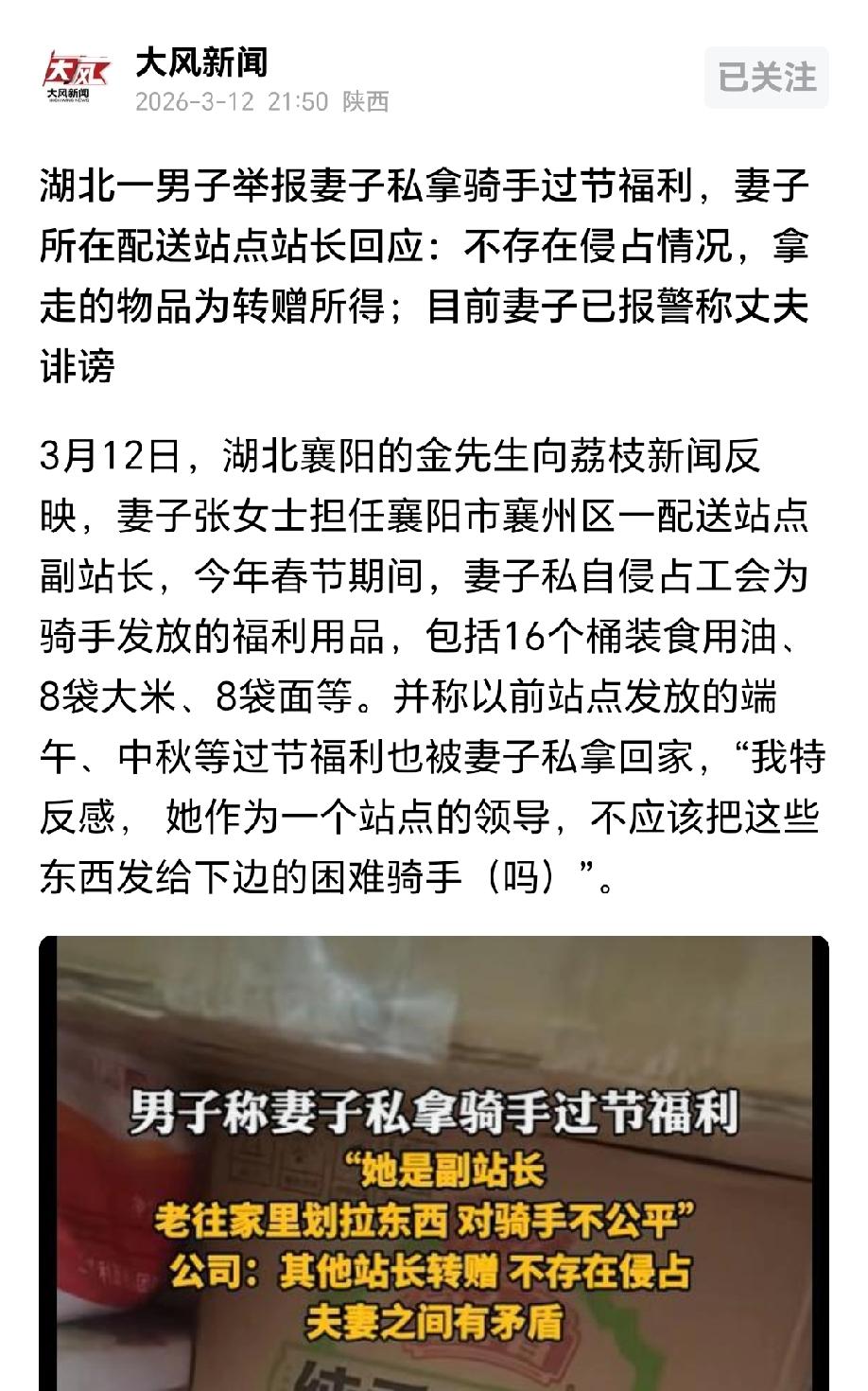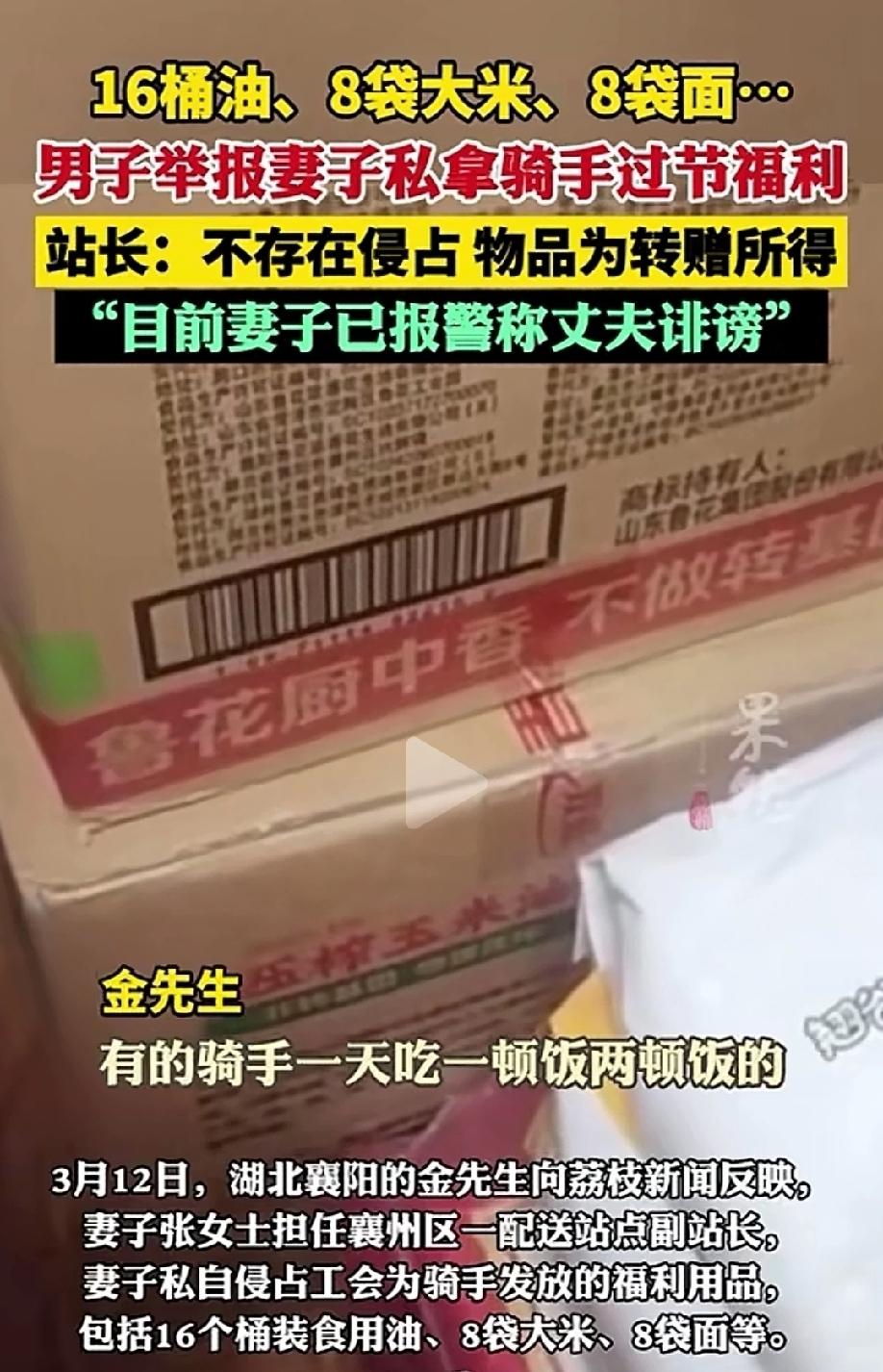 湖北襄阳,女子是配送站副站长,逢年过节都会拿些米面油回家,没想到这一举动却被丈夫却举报,说她侵占骑手过节福利。记者前去核实,站长回应,女子不存在侵占行为,她经常在站点给骑手做饭吃,拿走的物品都是大家给她转赠的,合情合法。随后,女子又反手报警,声称丈夫诽谤,要求追究法律责任。网友:这里面有故事! 不是一家人,不进一家门,张女士就因为从单位带回的几袋米面油,竟遭到丈夫举报,她不服气,反手又控告丈夫诽谤。 张女士是襄阳市襄州区一个配送站点的副站长,作为站点的领导,她平日里对同事照顾有加,不仅工作上以身作则,生活上也常把站点当家。 尤其是逢年过节,她都会亲手给忙碌了一年的骑手们做饭,大家都看在眼里,记在心里。 今年春节,工会给站点的骑手们发放了一笔过节福利,其中主要就是一些米面油,是专门送给辛苦的一线配送员的。 张女士在春节期间,一下子拿回家16桶食用油、8袋大米和8袋面粉。就是这一举动,引起了丈夫金先生的强烈不满。 丈夫金先生得知后,心里很不是滋味。 他觉得,妻子作为副站长,更应该严格遵守规定,把这些福利分给真正有需要的困难骑手,而不是自己带回家。 他对妻子这种“顺手牵羊”的做法特别反感,认为这是侵占了骑手的集体福利,性质很严重。 于是,在强烈的反对情绪驱使下,金先生做出了一个让所有人都没想到的决定,他向记者反映了情况,实名举报了自己的妻子。 记者接到线索后,迅速介入调查。他们首先联系到了张女士所在的配送站点。 万万没想到,站长的回应却与金先生的说法大相径庭。 站长告诉记者,经过向工会核实,张女士完全不存在所谓的“侵占”行为,相关情况已经如实上报给了公司。 站长还给记者解释,张女士平时经常在站点为骑手们做饭,和大家关系非常融洽。 这次她拿走的那些米面油,并非私自侵占,而是站长和其他几位副站长看她平时太辛苦,特意转赠给她的。 事情发展到这里,出现了戏剧性的转折。 丈夫金先生的举报,不仅没有证实妻子的“侵占”行为,反而让夫妻间原本就存在的家庭矛盾彻底爆发。 张女士得知丈夫不仅质疑她,还把家丑外扬后,既委屈又愤怒。在她看来,自己光明磊落,东西是同事转赠的,丈夫不分青红皂白就举报,还到处乱说,这分明就是诽谤。 于是,张女士在医院养伤期间,选择了报警。她正式指控丈夫诽谤,要求追究其法律责任,维护自己的名誉。 一个是觉得妻子占了公家便宜的丈夫,一个是被误解、甚至可能是被枕边人不信任的妻子,一场由过节福利引发的家庭风波,就这样闹得沸沸扬扬。 不少人觉得,这事儿“里面有故事”,究竟是丈夫小题大做、误解了妻子,还是其中另有隐情,目前还需要等待法律和事实来给出最终的答案。 按照常理来说,有人举报的话,站长都会第一时间严查,这样维护张女士,反而显得不太正常。 妻子往家里拿东西,丈夫应该是高兴都来不及,怎么还会大义灭亲举报妻子呢?到底是感情破裂,互相伤害,还是丈夫有什么难言之隐呢? 《民法典》第一千零二十四条规定:民事主体享有名誉权,任何组织或者个人不得以侮辱、诽谤等方式侵害他人的名誉权。 本案中,张女士所取米面油系同事自愿转赠,站长与工会已核实无侵占。 丈夫金先生未核实事实,便向媒体举报妻子侵占骑手福利,属于捏造虚假事实、公开散布,客观上降低张女士社会评价,侵害其名誉权。 若金先生主观故意、情节严重,还可能触犯《刑法》诽谤罪。 张女士报警追责,于法有据。而其领取赠与物品,属合法民事行为,不构成侵占。 即使是夫妻间未充分沟通引发名誉纠纷,也应依事实与法律厘清相关的责任。