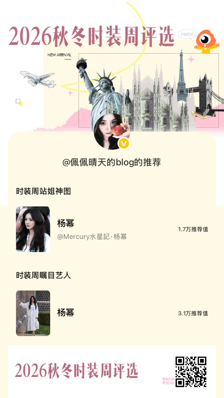 时装周瞩目艺人推荐每天不忘投🎫杨幂2026秋冬时装周评选