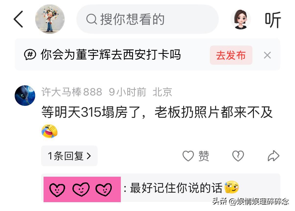 AWE的热度还没过去, 就有人在我的评论区说宇辉315要塌房, 我没生气,只是好奇——天天喊着宇辉要塌房的人不累吗? 这些人,不但要时刻关注宇辉的动态,还要记下他说过的话,甚至经常蹲守在直播间,看他卖过的东西,遇到合适的商品再买两单。耗时耗力还费钱! 后来我想明白了——这些人不是真的相信他会塌,只是希望他塌。 因为希望他塌,所以不需要证据,不需要实锤,只要到日子了,就出来喊一嗓子。喊多了,自己都信了! 你说他要塌,可是他站得越来越高了。 AWE展会上,他和央视主持人朱广权并肩逛展,和华为总裁余隽一起畅聊,和银河通用机器人合伙人傅强深入交流,他和一众科技大咖站在抖音商城科技晚的舞台发言…… 真正站得稳的人,从来不需要自己证明塌没塌,看他身边的人就知道了!