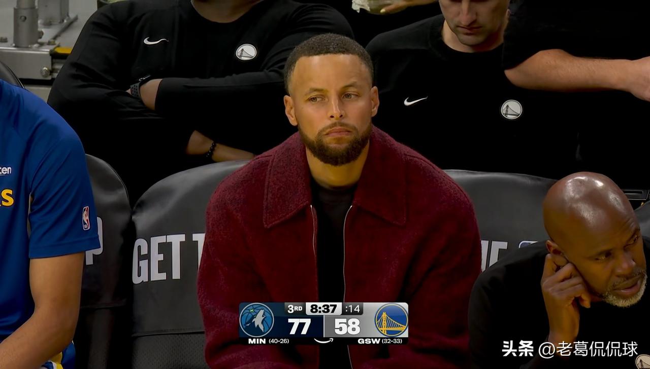 勇士超级巨星库里真是太萎靡不振了!在今天勇士主场迎战森林狼的比赛中,当时比赛进行到了第三节的8分37秒,勇士以58:77落后森林狼19分,形势看起来特别危急。这个时候转播镜头给到了勇士的替补席,只见因伤无法出战的库里无精打采的坐在场下,整个人看起来非常的萎靡不振,他的眼神里充满了沮丧和失落。从库里的面部表情来看,库里对于球队的表现不仅感到失望,甚至有一些绝望。