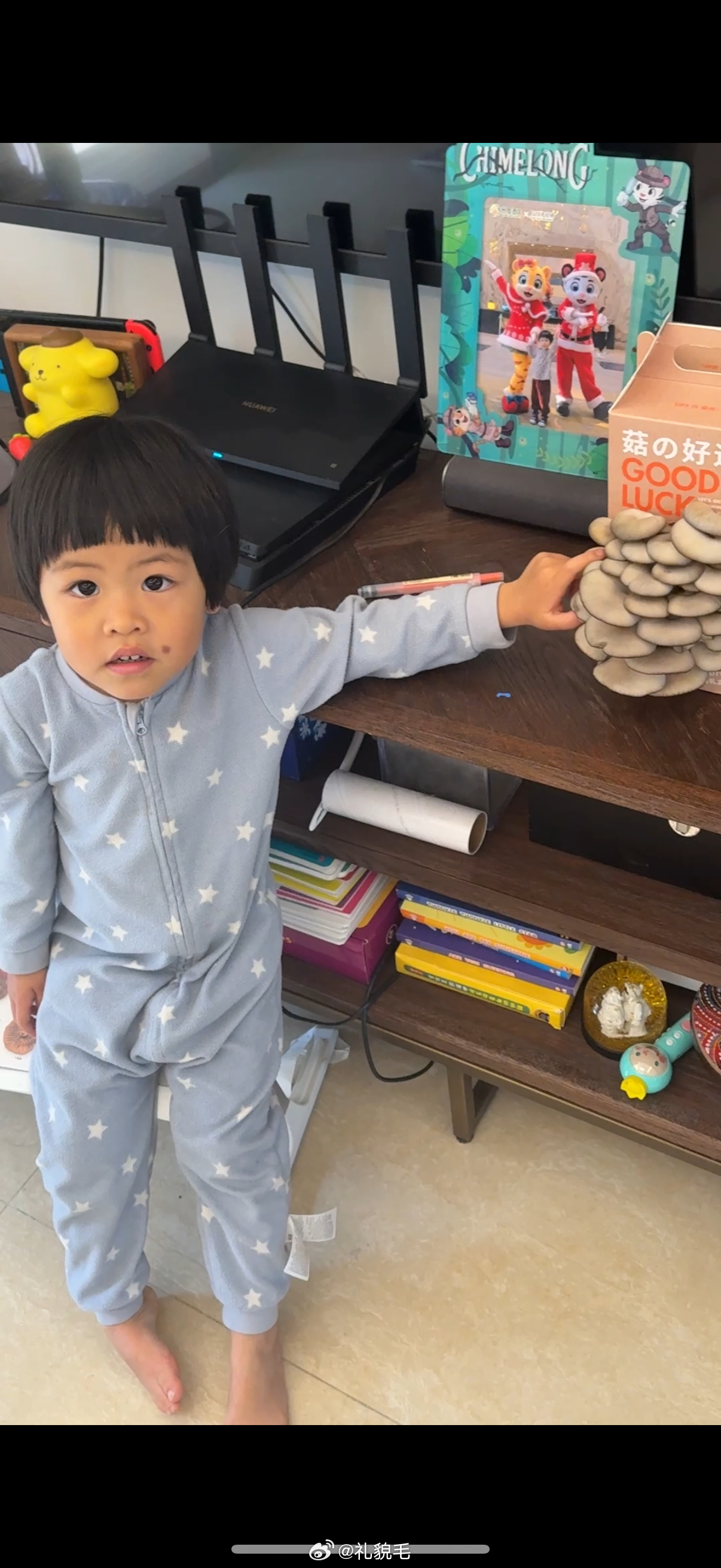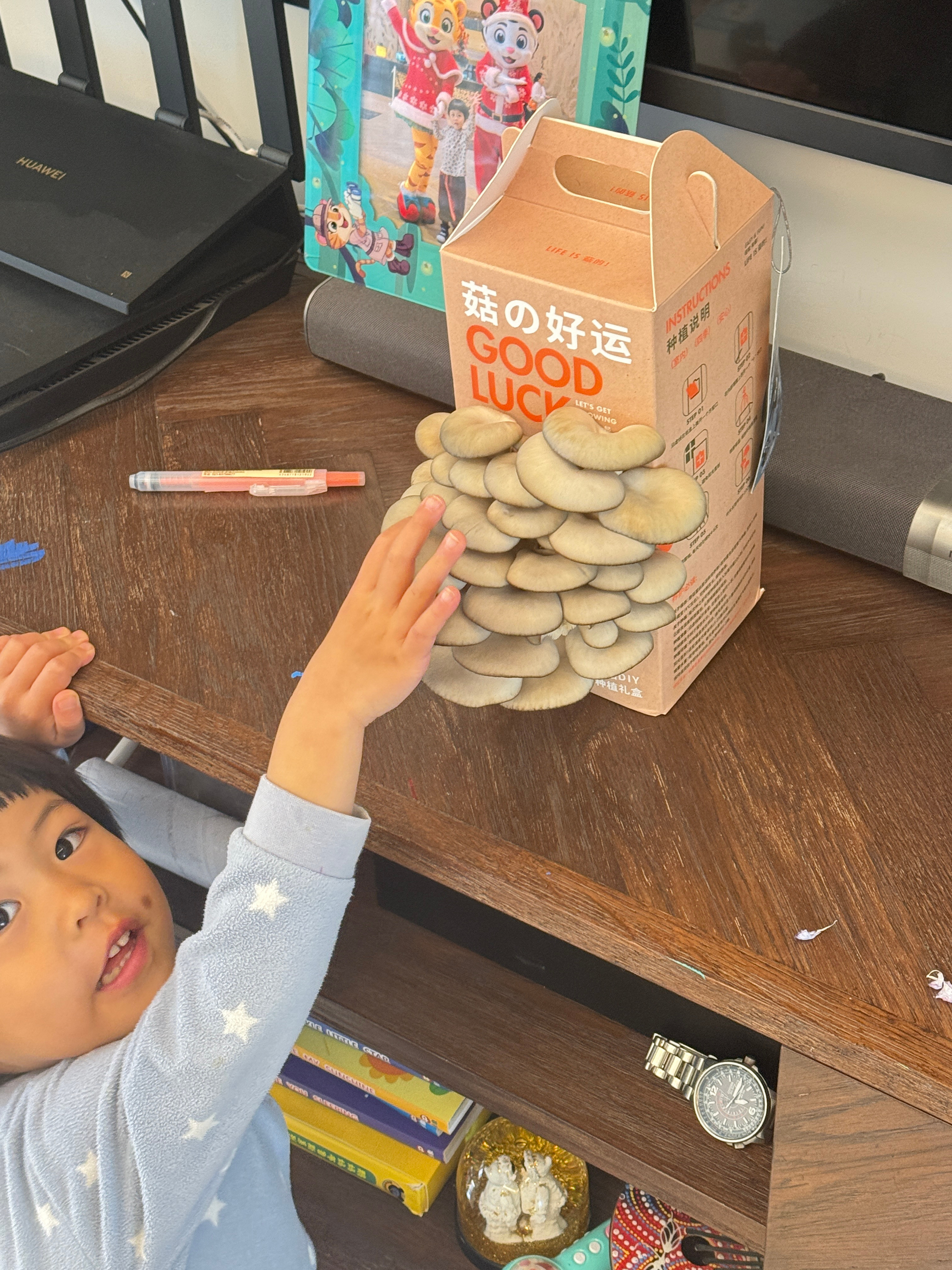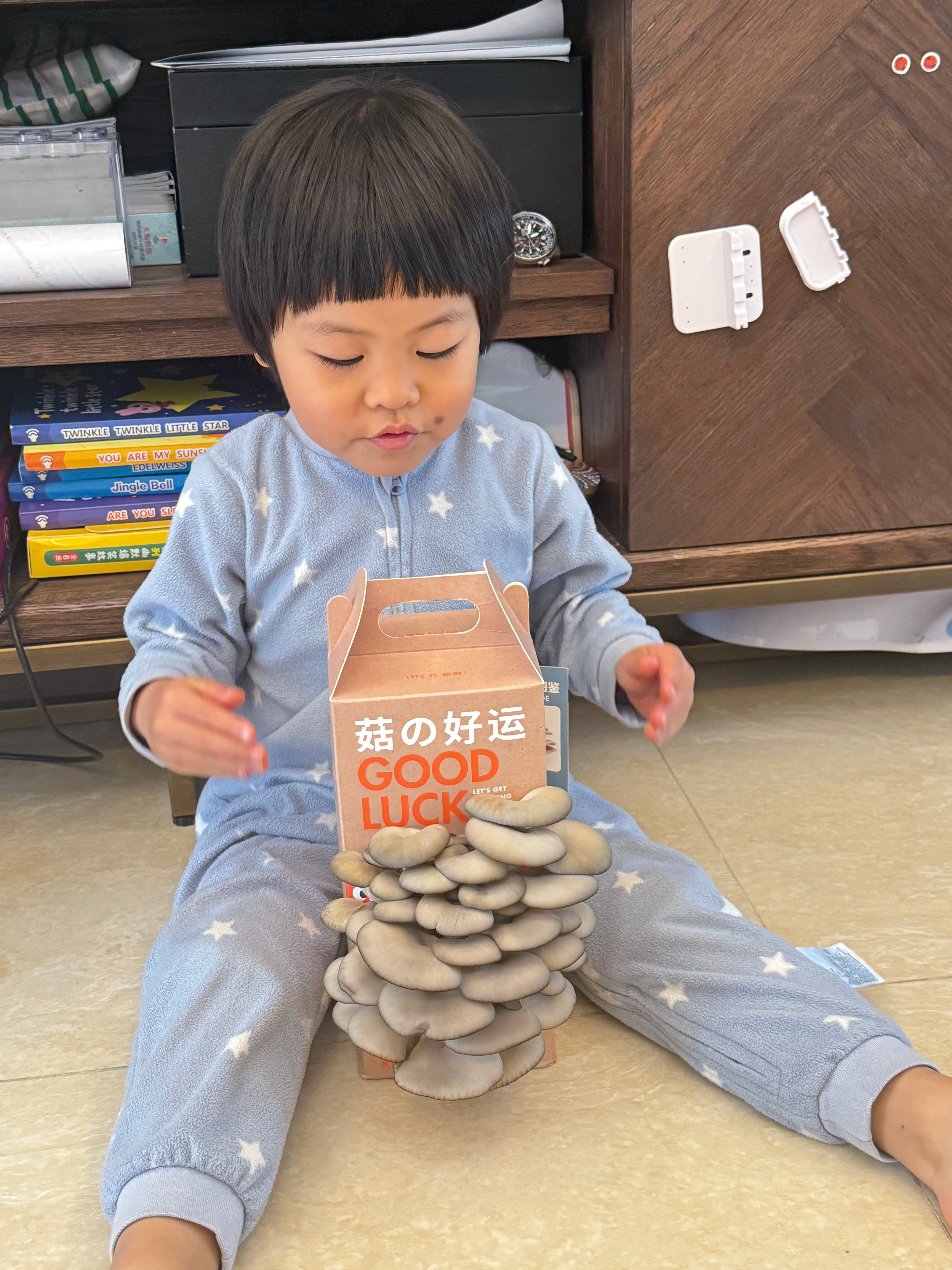 朋友送的平菇盆栽,球每天要检查好几次,给蘑菇喷水,提着蘑菇走来走去,说蘑菇快长大,长大就能吃了。