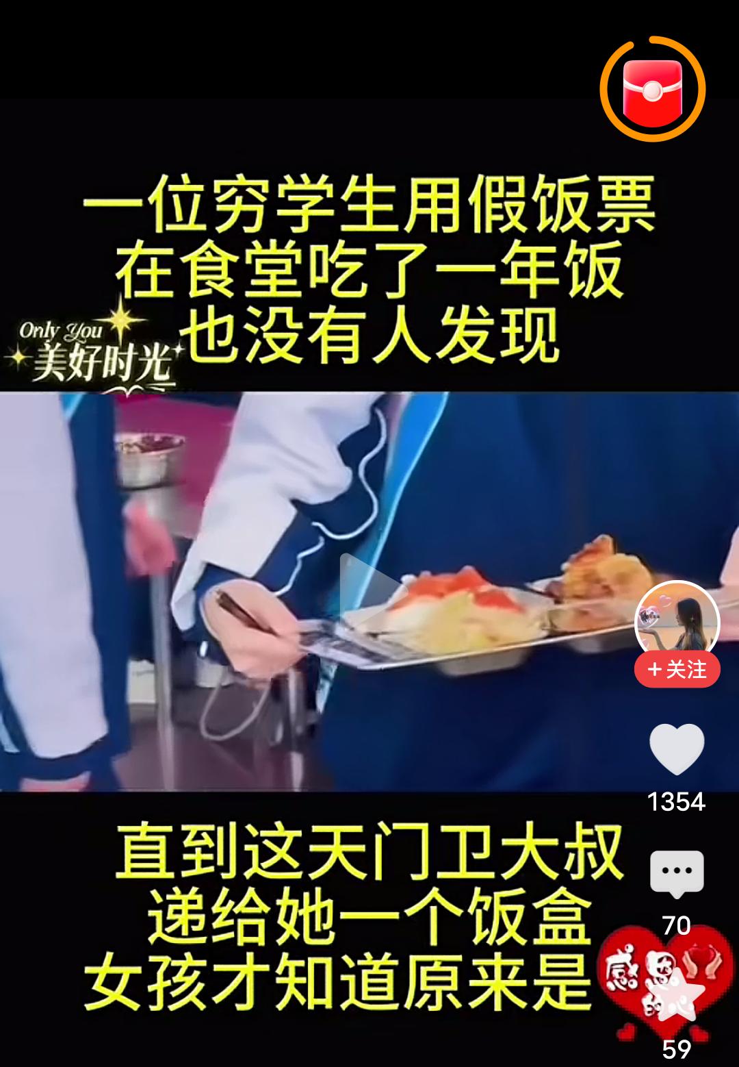 食堂里的秘密:门卫大叔的温暖饭盒。 在女孩刚出生三个月大时,因为家里实在太穷,她的母亲就偷偷地离开了家。 此后,老实巴交的父亲,守着贫穷的村子,用布满老茧的双手抚养她长大,哪怕农忙时累到直不起腰,也要从微薄的收入里挤出钱供她上学。 当她收到大学录取通知书的时候,父亲却在稻田劳作时遭遇不幸,被突然失控的收割机卷去了一只手臂,殷红的鲜血染红了金黄的程穗,也让本就不幸的家庭更加雪上加霜。 上大学时,女孩每天中午只吃2毛钱的酸辣白菜,不是因为它更好吃,只是因为更下饭。 一天上课,她手里紧握着一元的饭票直冒冷汗,纠结着是花一元钱吃一次美味的鱼香肉丝,还是再吃酸辣白菜呢? 但是,回想起父亲那条血淋淋的断臂,那是父亲为了她,咬牙坚持的见证,一元终究换成了5张2角饭票。 这时有人和她说,学校社团有人找她,慌乱间她不小心将社团公章印在了饭票上。突然间,一个大胆的想法在她的脑海里生成了,因为学笑饭票管理制度不严格,只需拿一块硬纸壳当假饭票,用红色笔写上金额,至于公章,再拿一块大橡皮雕刻上那些字,印油一盖即可。 不久后,她的面值一元的饭票诞生了。第一次用会不会被发现?打饭一共有五个窗口,其中四个窗口都是凶神恶煞的中年妇女,只有2号窗口打饭的是个聋哑男人。 他的神奇之处就在于能根据口型判断你要的菜,每次盛出的饭量只多不少 ,所以面前总是排着长长的队伍。 她怀着忐忑的心情选择在2号窗口下手,心想就算被他发现,趁他说不出话的时候,自己也可以赶紧溜走。 轮到她了,她指了下鱼香肉丝,他拿着女孩的饭票迟疑地看了她一眼,最终还是为她打了饭。 从那以后,这样的生活一直持续了一个学期多。女孩身体瘦弱的她慢慢变得圆润起来,脸颊上也有了些许血色。 有一天她径直奔向2号窗口,却意外发现换了人,心中顿时涌起一阵失落与不安。 在她回教室的路上,门卫递给了她一个饭盒,里面竟然是装着她花出去的假饭票和一封信,还有100张一元的饭票。 那位聋哑大叔在信中写道:别再用假饭票了,被人识破就不好了,我要回老家照顾母亲,以后不再回来了,努力学习吧!困难只是暂时的,未来的路还长,要堂堂正正地走下去!