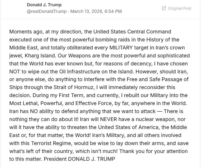 英国天空新闻的分析如下: 当特朗普总统在 Truth Social 上发帖时,你不必去揣测潜台词。 对Kharg岛进行轰炸的动机是显而易见的——字面意义上,有些甚至是大写字母。语气是表演性的,措辞绝对,几乎像电影般,并为多重受众准备。 他的第一个受众是伊朗。他强调了打击的彻底性和该岛的脆弱性。该岛位于波斯湾,靠近所有主要航运路线,处理伊朗90%的石油出口。 他发出的信号是,这个国家在经济上最重要的“皇冠明珠”,就在美国的掌控之下。 潜在的信号是威慑。如果军事设施可以被打击,石油终端也可以被打击,“如果伊朗或其他任何人”破坏航运。 他的第二个受众是全球石油交易商。他声称美国已经“完全摧毁了每一个军事目标”。注意那些大写字母。他强调自己“选择不摧毁”该岛的石油设施。 那是因为他知道,瘫痪Kharg会导致原油价格飙升,据一些分析师,可能高达每桶150美元。 这使得该岛不仅是伊朗的经济核心。它是全球经济的压力阀。一旦发生冲突,波斯湾的水域到欧洲、亚洲和美国的加油站都会产生连锁反应。 还有第三个受众:国内观众。语言简洁、有力、充满力量感。 轰炸已经结束,这是历史性的,他宣称美国军队“致命、强大且高效”。这将复杂的地缘政治行动转化为一个简单的叙事,针对已经对这场战争感到紧张的支持者基础。 综合来看,总统的帖子是政治戏剧——技术性解释较少,战略信号更多。