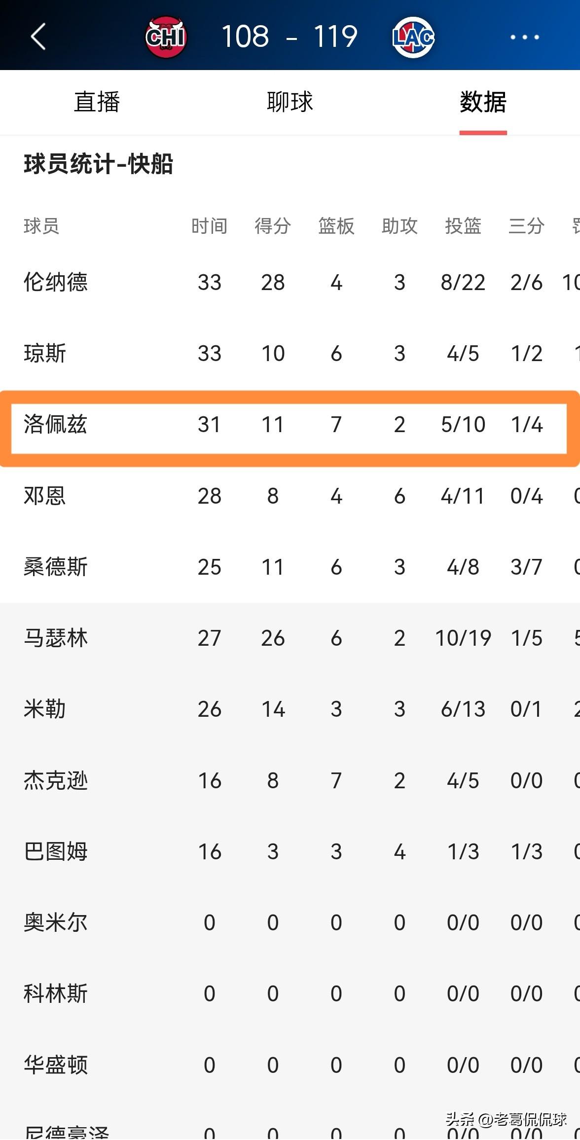 快船老将洛佩兹真是太让人感动了!在今天快船主场以119:108战胜公牛的比赛中,老将洛佩兹在攻防两端都展现出了非常强的拼搏精神,他甚至送出了不可思议的5记盖帽。 整场比赛下来,洛佩兹首发出战31分钟,投篮10中5,其中三分球4中1得到11分7篮板2助攻5盖帽,没有出现任何的失误,他的场上正负值为+4。 坦白说,当我看到洛佩兹在攻防两端都不遗余力的时候,我真是深受感动,我在洛佩兹的身上看到了他对胜利的渴望和对篮球的热爱。