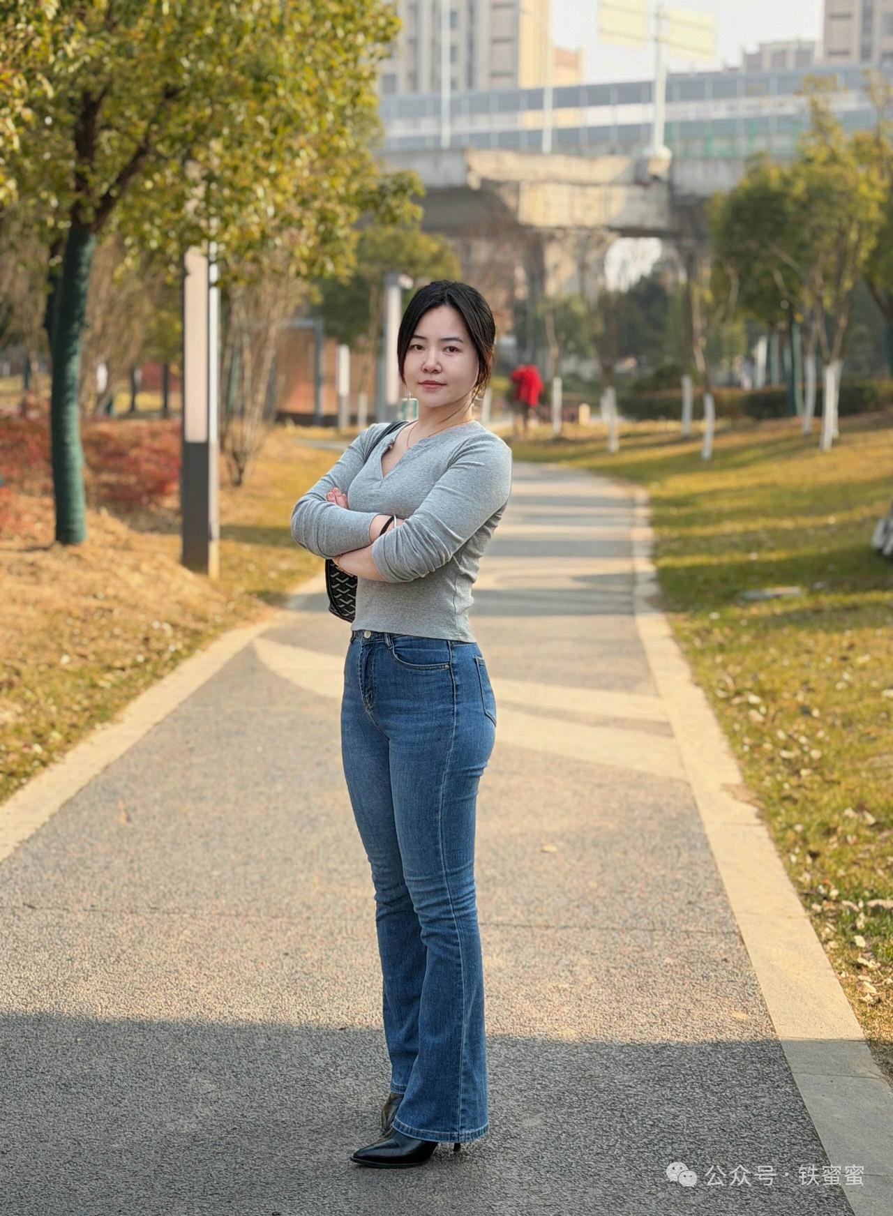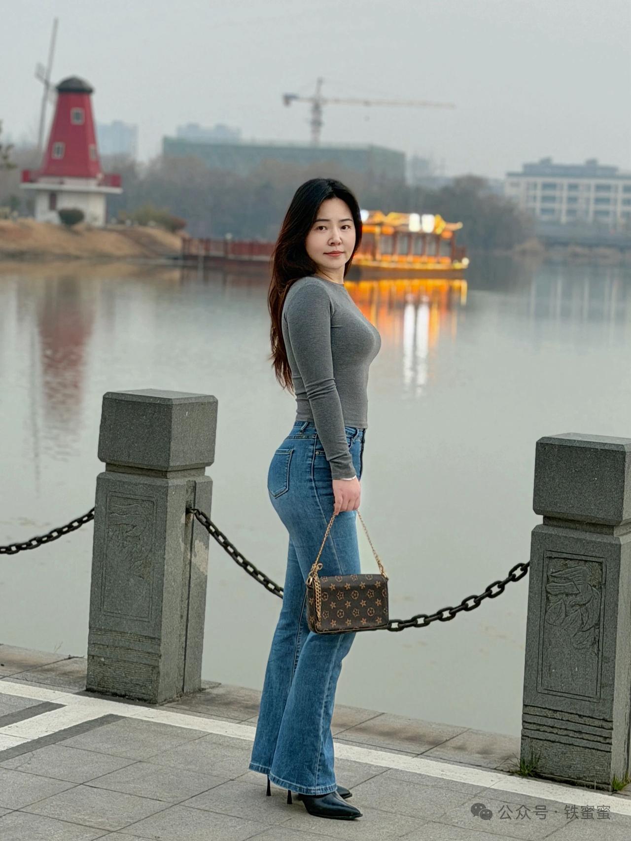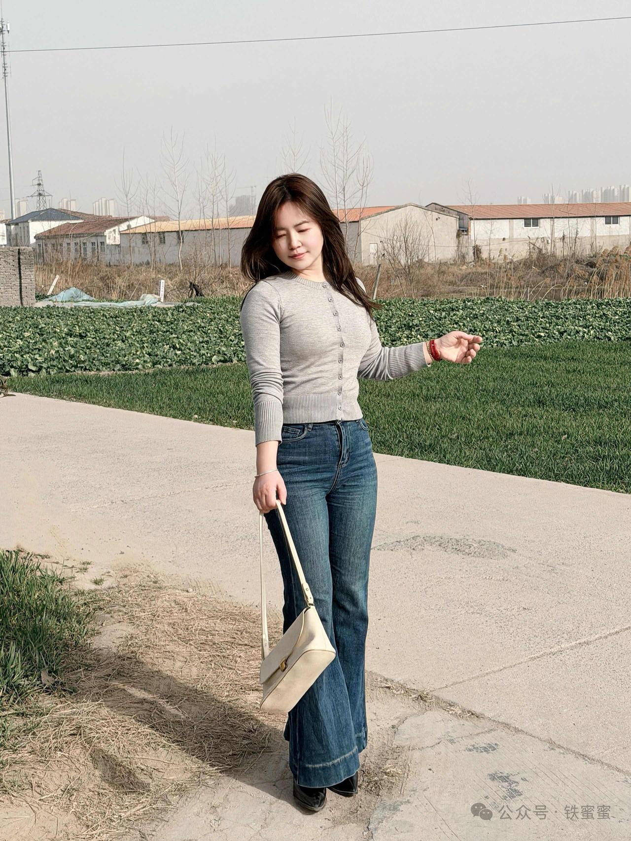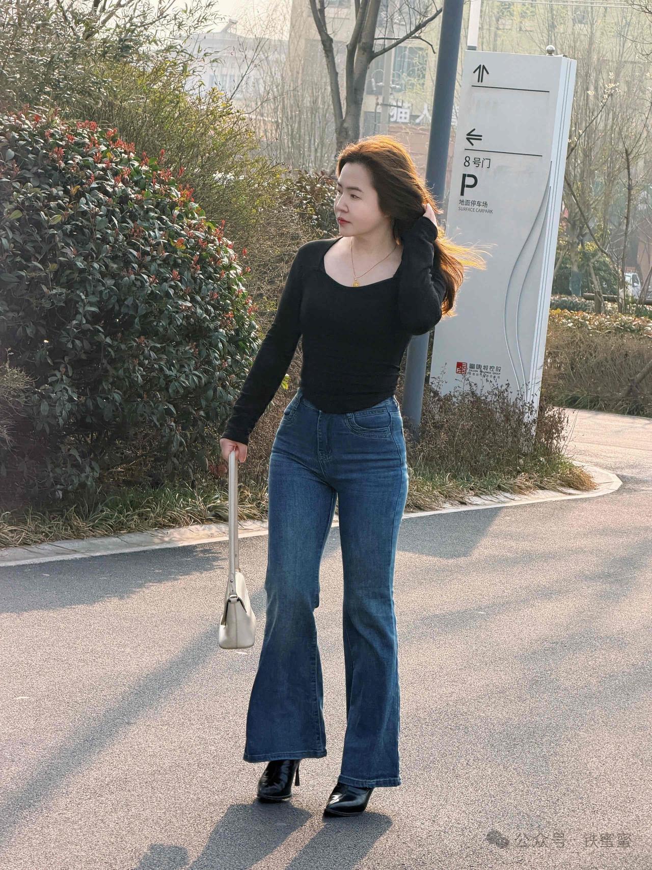 美女穿着牛仔裤,手拿小包走路。