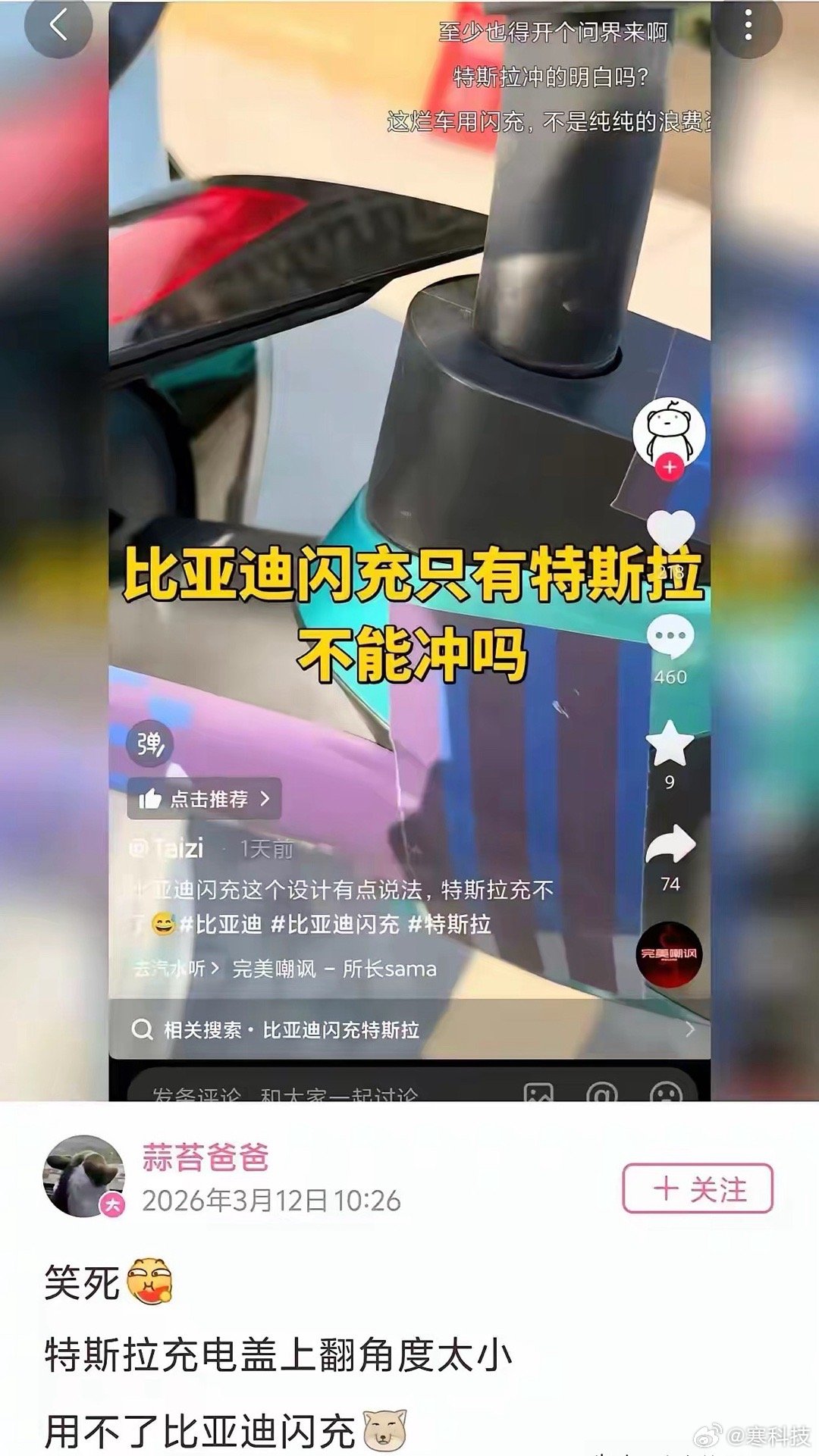看到这个视频真是笑死了,比亚迪的闪充把手是朝上的,特斯拉因为充电口盖朝上并且开口角度太小插不进去,所以充不了电