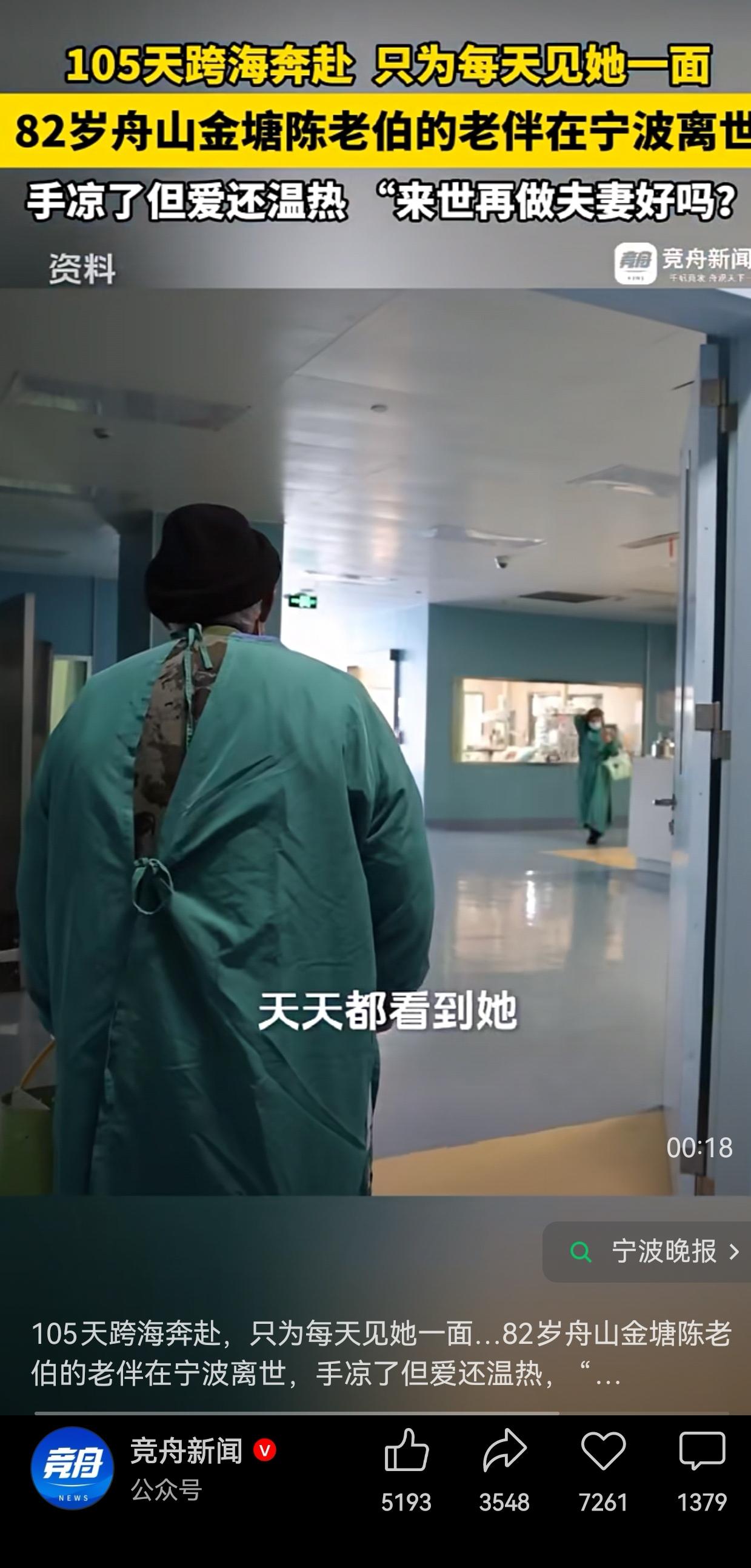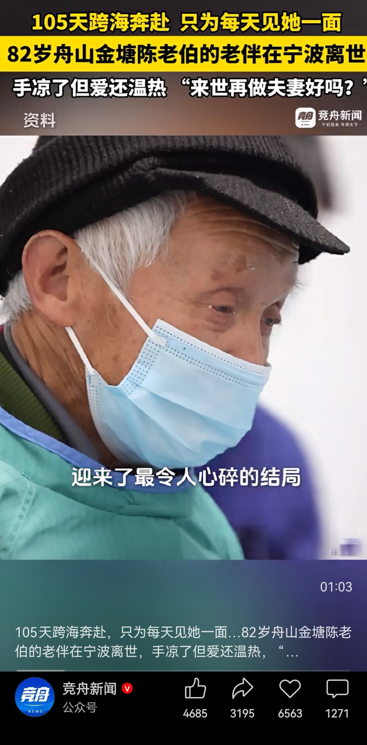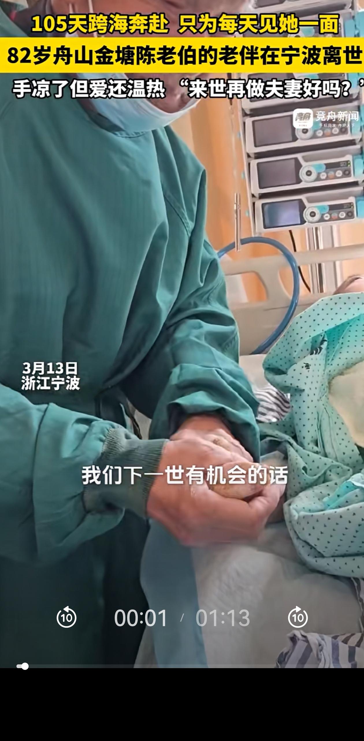 最动人的爱情!3月13日,宁波的阿姨还是走了,看到82岁的老伯在病床前含泪作别:“下辈子还做夫妻”时,哭了…… 陈老伯为了给老伴治病,用尽家财;为了在ICU探视半小时,每天需要凌晨4点半起床,从舟山金塘辗转到宁波。 105天风雨无阻,单程两个多小时,只为那半小时的相见。 对老伯来说,ICU那扇门背后,就是他的整个世界,没有轰轰烈烈地誓言,只需每天跨越山海见老伴一面。 看哭了!阿姨的最后105天,老伯每天都没有缺席,风雨无阻,单程两个多小时,只为那半小时的相见! 阿姨还是走了,老伯在病床前哭着说:“你好好安息啊!我们下一世有机会的话,还做夫妻啊……”这种感情,不是年轻人那种轰轰烈烈的浪漫,而是实实在在的舍不得! 为了照顾老伯每天的奔赴,社会各界都在默默关心他,医院特意为他调整探视时间;交通部门知道后免了车费还给他留座…… 当一份深情被看见,整个世界都会为他让路。 原来世间真的有最动人的爱情,跨越生与死的距离,无论你在哪扇门后,我都会找到你,这辈子不够,下辈子再续! 这份跨越山海的陪伴,就是“少年夫妻老来伴”最美的样子。 愿老伯节哀,也愿他和阿姨,来生还能做夫妻。 信息来源:竞舟新闻