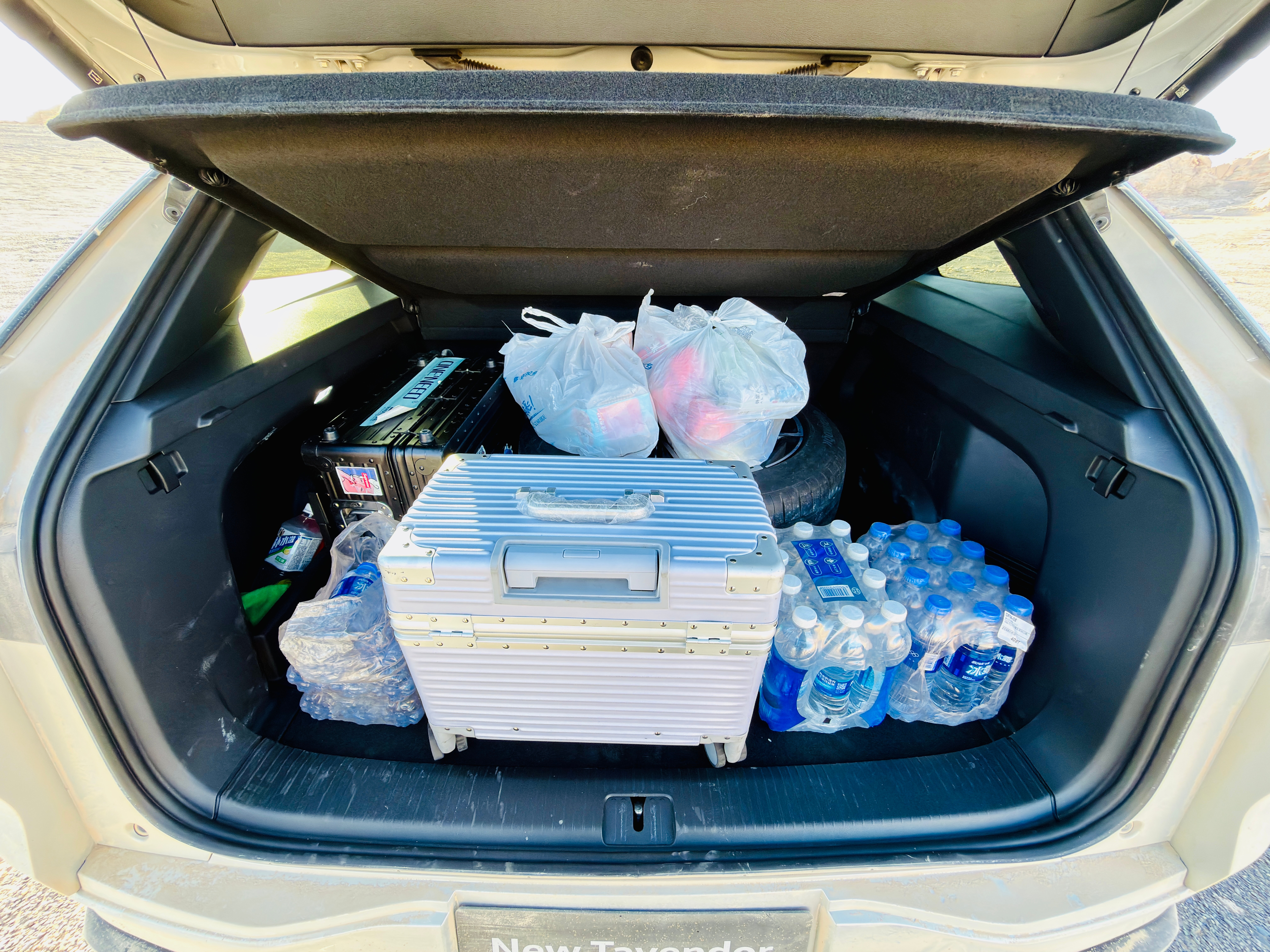 因为涉及到长距离的非铺装道路,在后备厢里多带了一个21寸全尺寸备胎,完事儿还能再装两个行李箱和一大堆零食饮料,这还仅仅是后备厢隐私盖板以下的空间。大五座真爽,乘坐空间和后备厢都大。 哈密