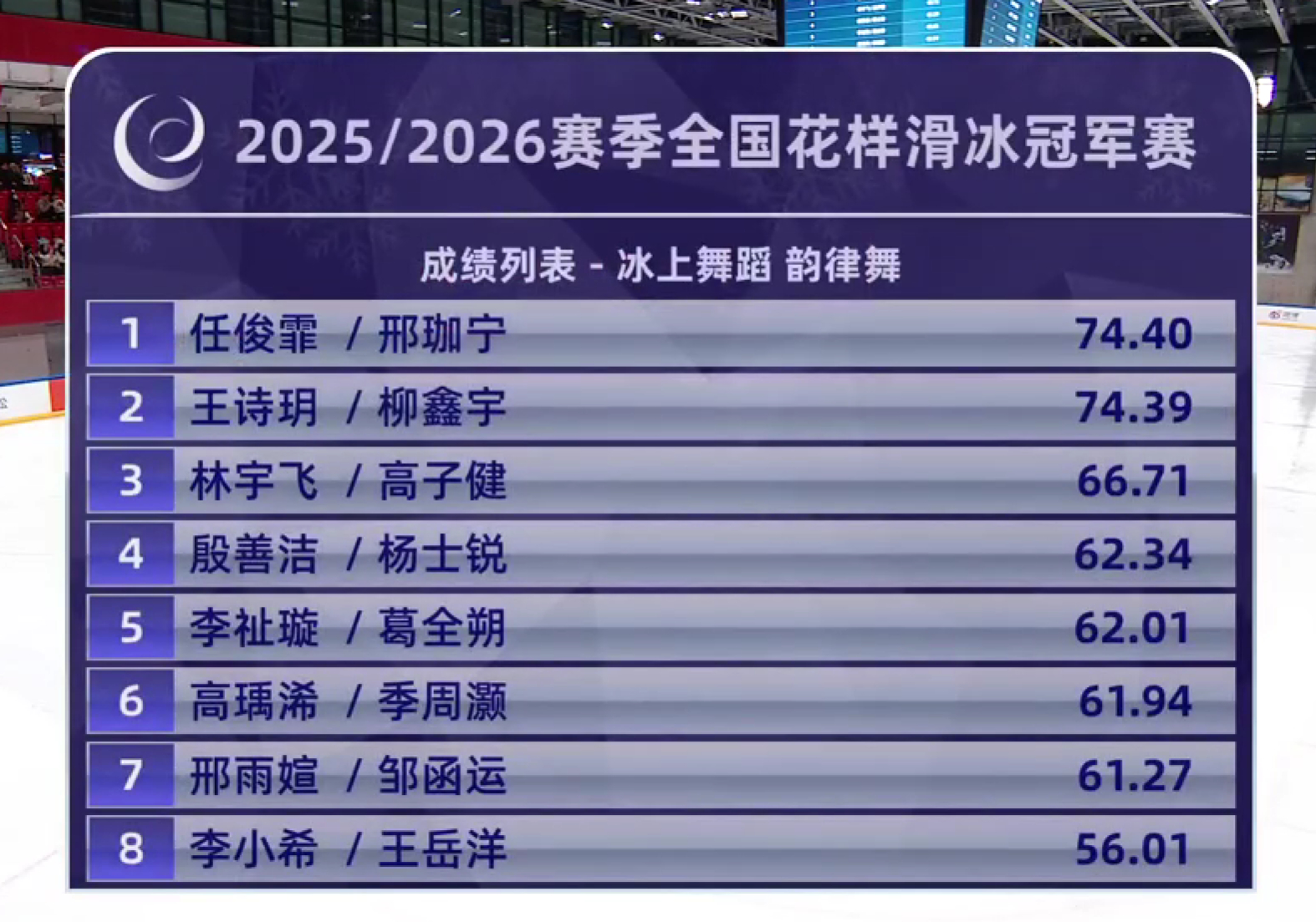 2025/2026赛季全国花样滑冰冠军赛冰舞韵律舞排名