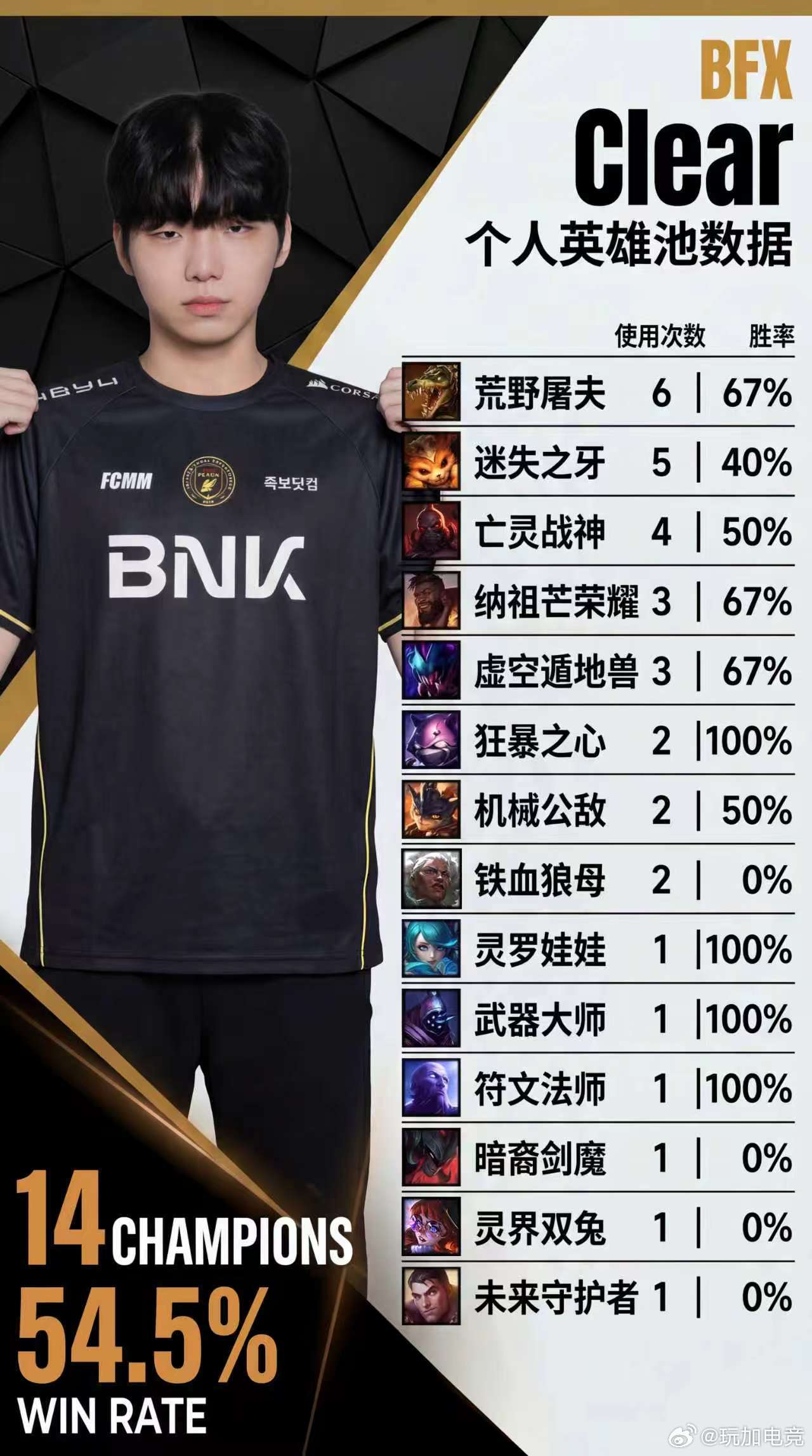 BFX Clear 14个英雄,选用最多英雄为鳄鱼(6次),胜率67%