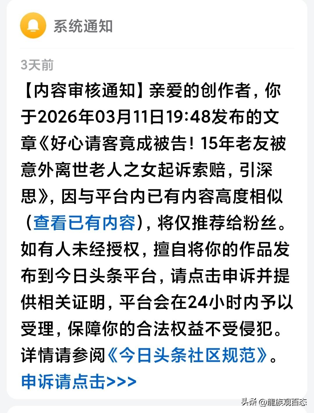能这样抄袭和审核吗? 太过分了!太让人窝火了! 头条说我的一篇文章抄袭了别人的内容,限制了我的流量。 点进头条的审核通知中一看,一个叫“纠纷调解站”的头条号发的一篇文章与我在百家号发布的篇文章的内容一模一样,从标题到结尾,一个字都没有改,就连标点符号都没有,改一个。甚至连我那篇文章中所带的百家号平台的话题都没有删除。就那样从我的百家号里通篇复制,直接粘贴到了他的头条号里,发布到了头条平台上。 我为了错开一些发布时间,在头条平台晚发布了一点。 明明是别人100%抄袭、照搬了我的文章,头条竟判定我抄袭,让我整改。 我就想问问,头条平台的审核过程和审核机制到底是怎样的?请给我个解释! 能这样抄袭和审核吗?