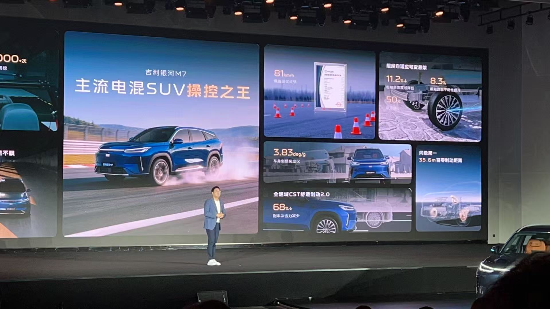 吉利银河M7同样做到了操控与舒适俱佳,基于GEA Evo全球智能新能源架构开发,采用了簧上簧下精准控重,双层中空下摆臂,双层中空后上控制臂,后下摆臂集成后弹簧设计,做到了低速不累、高速不飘的转向质感,麋鹿测试成绩达到了81km/h,制动系统采用博世ONEBOX集成方案,百公里制动距离为35.6m