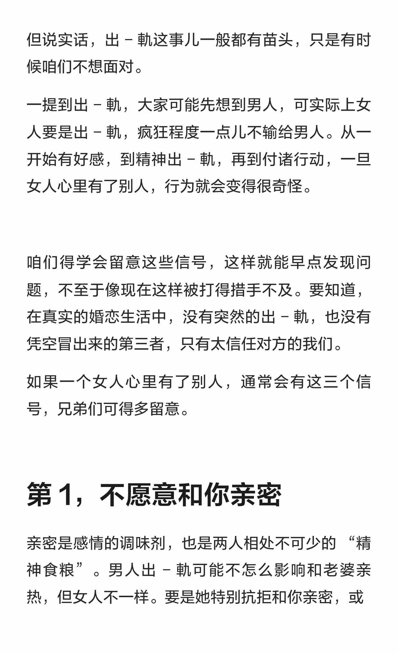 女人出过G一定一定有这三个信号 发现妻子出轨时,震惊与困惑交织。出轨信号包括不愿亲密、保留隐私和专注异性朋友。这些迹象提醒我们,婚姻中不应忽视潜在问题,及时沟通和关注是关键。 老婆出轨 情感树洞 男性必看 老婆要离婚我不想离怎么办 极限运动体验 建筑师 男人 富二代 西装