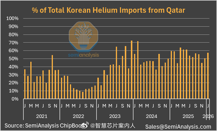 SemiAnalysis数据,韩国进口的氦气有50%以上来自卡塔尔。卡塔尔提供了全球1/3的氦气。