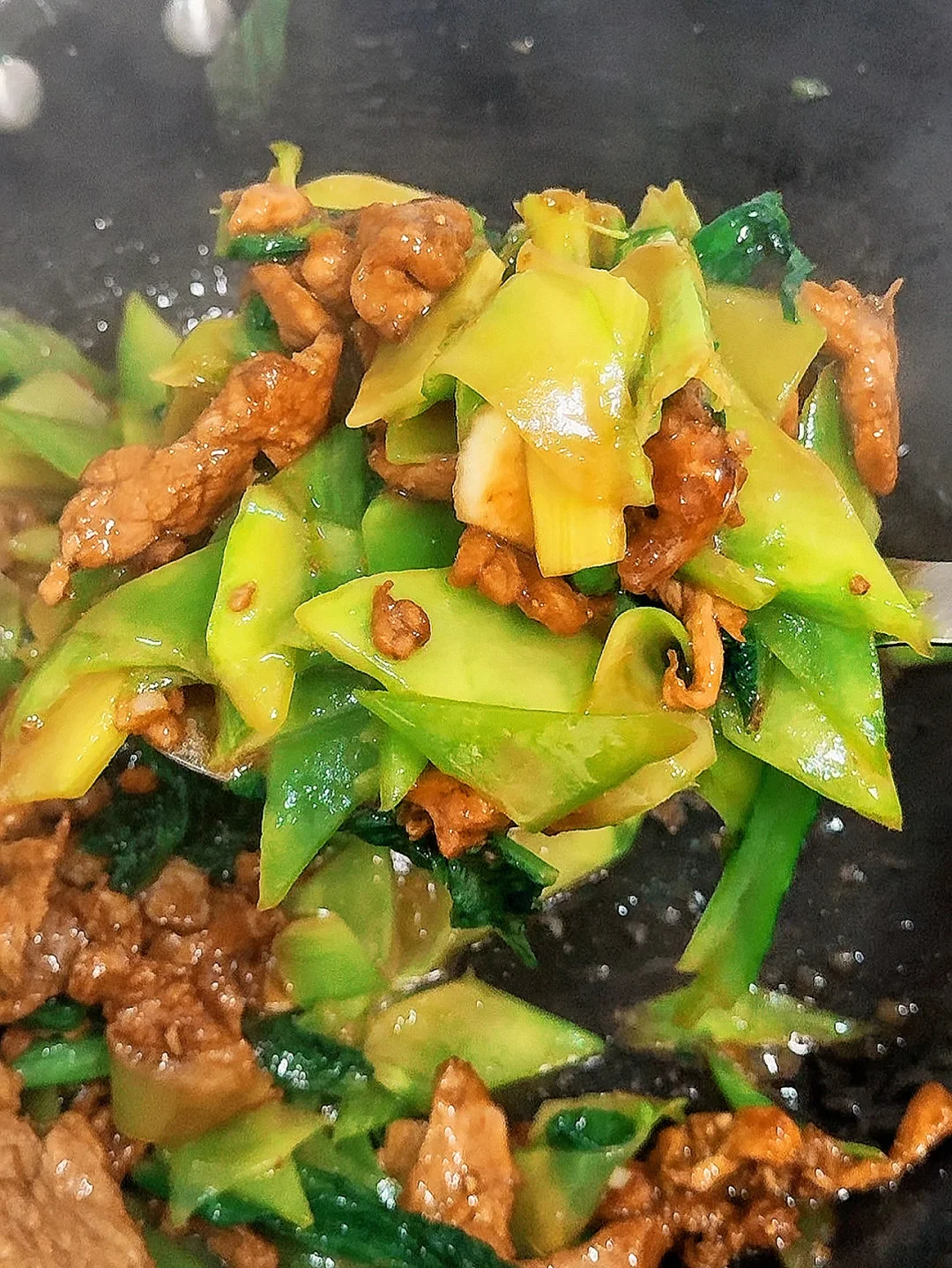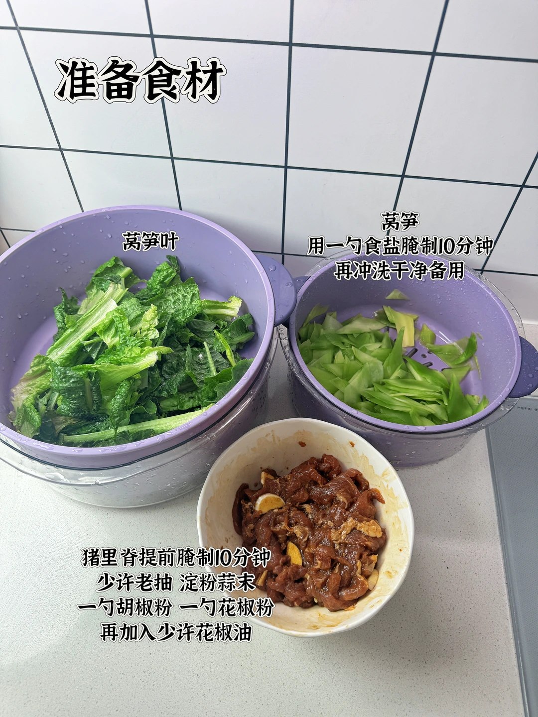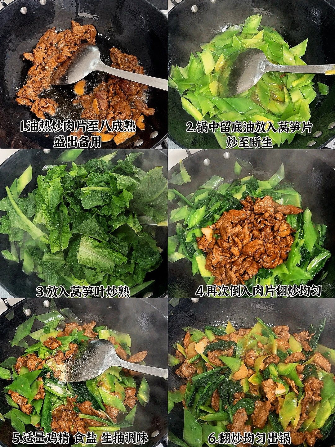 📜食材:莴笋、猪肉 🍳做法: 1.油热炒肉片至八成熟盛出备用 2.锅中留底油放入莴笋片炒至断生 3.放入莴笋叶炒熟 4.再次倒入肉片,翻炒均匀 5.适量鸡精,食盐,生抽调味即可。