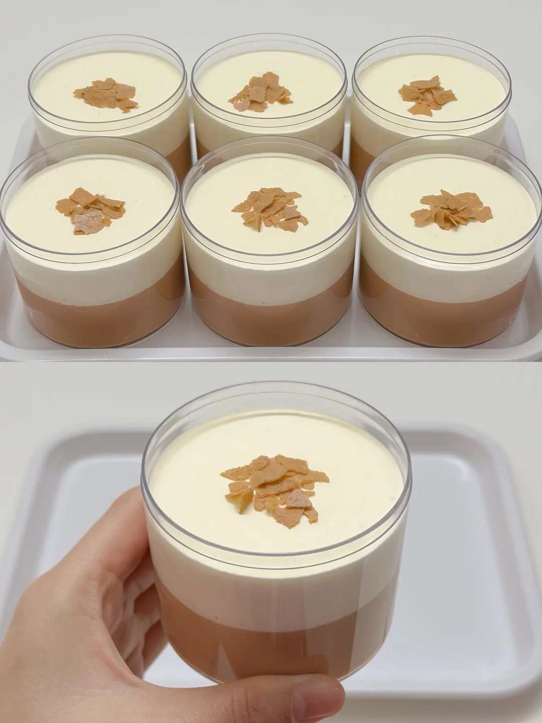 3️⃣将咸法酪挤在奶冻上,震平整,中间放上少量黄油薄脆片装饰一下即可。