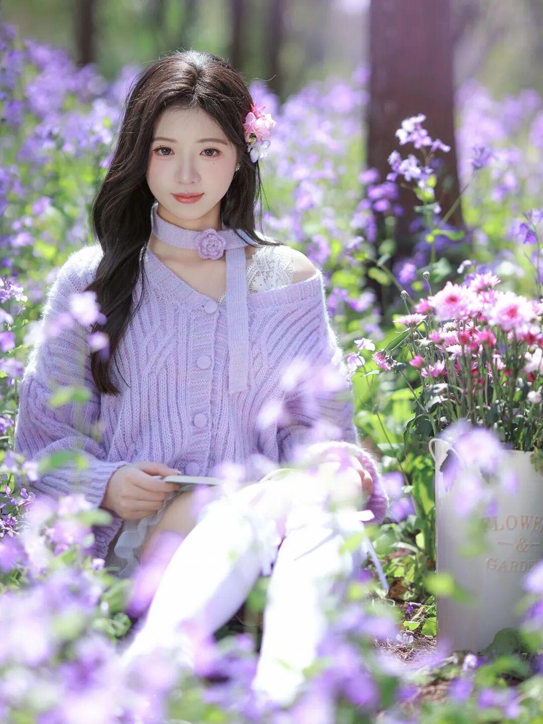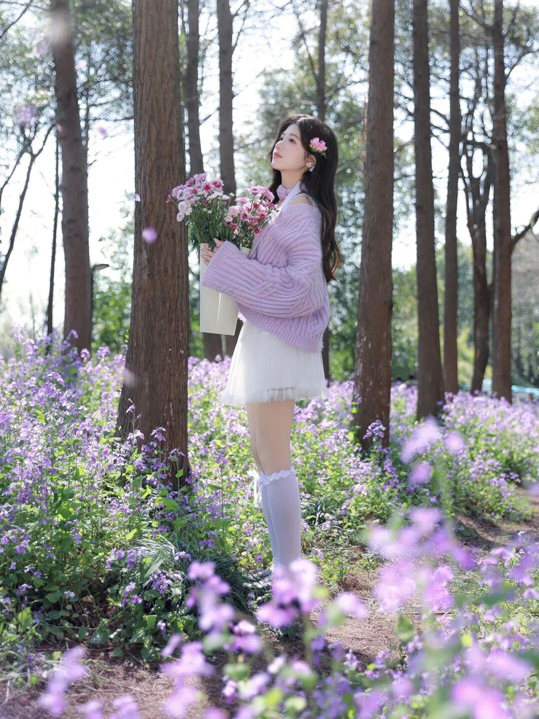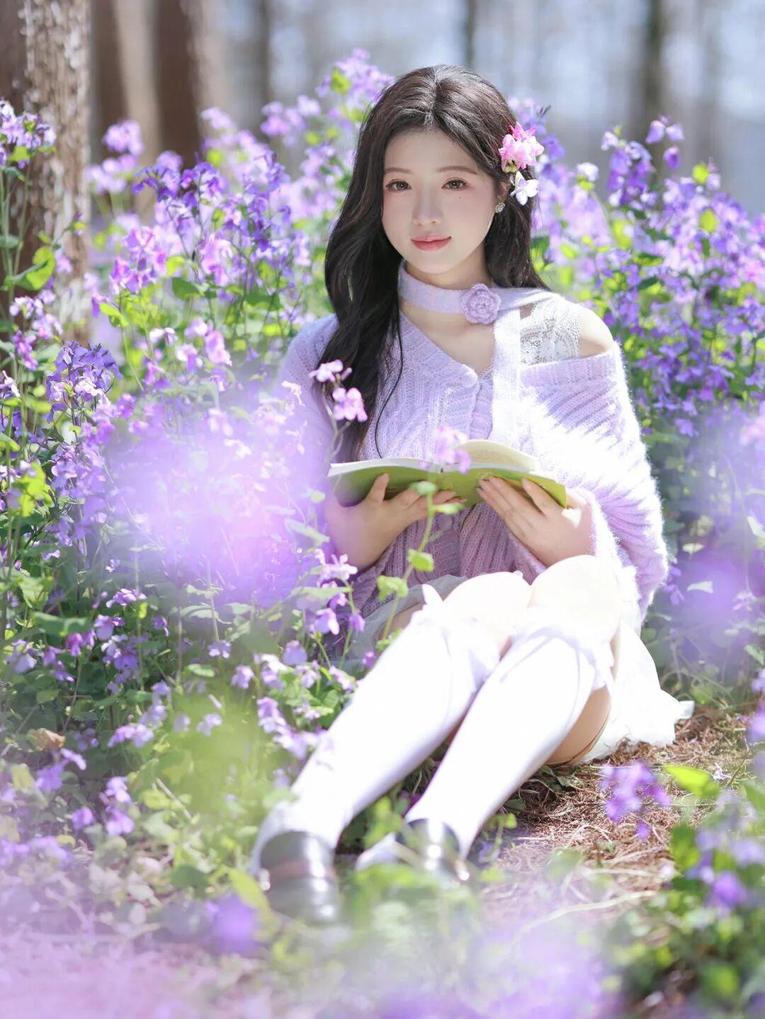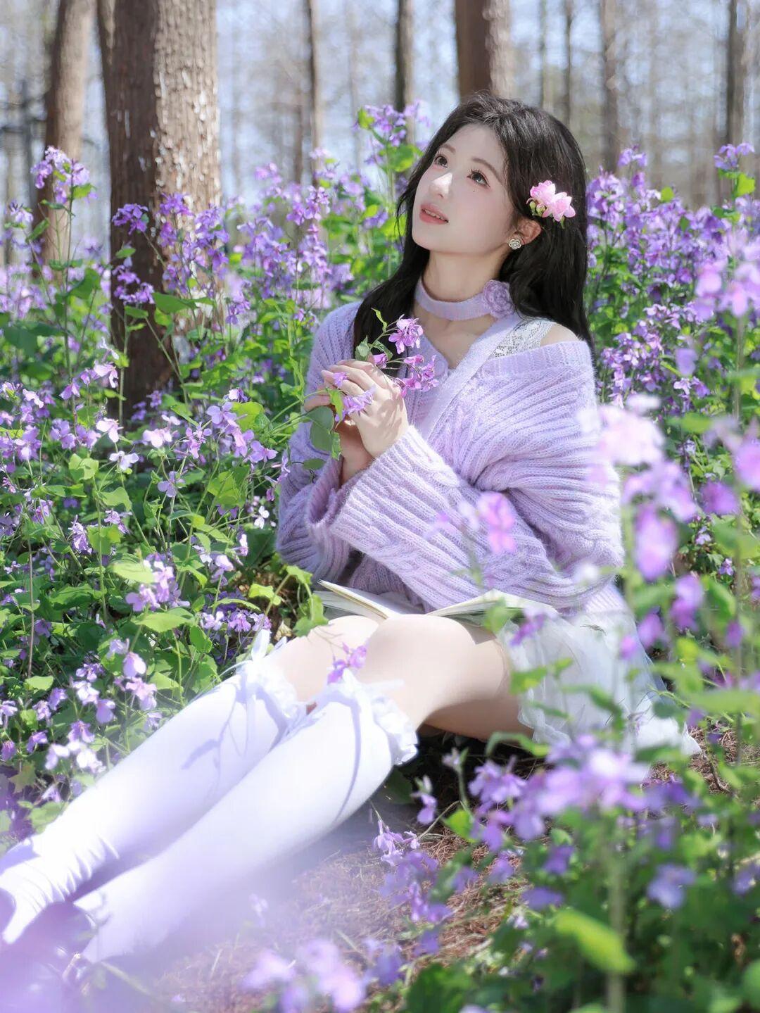 她穿着香芋紫宽松针织开衫,柔软的纹理带着慵懒感,内搭白色蕾丝小衫,露出一侧肩头,甜而不媚;下身是轻盈的白色纱裙,搭配同色系带长筒袜,脚踩小皮鞋,清新又减龄。 发丝间别着一朵粉花,颈间系着同色系的玫瑰颈带,妆容清透,眉眼温柔,和漫山遍野的淡紫色花海相映成画。 她时而在花丛中漫步,裙摆轻扬;时而蹲坐或席地而坐,捧着书本阅读,或是轻拈花枝、抬头望向林间阳光,眼神澄澈又带着笑意。 阳光透过高大的水杉树洒下斑驳光影,朦胧的紫花前景让画面更添梦幻感,整体色调柔和,像把整个春天的温柔都揉进了镜头里。