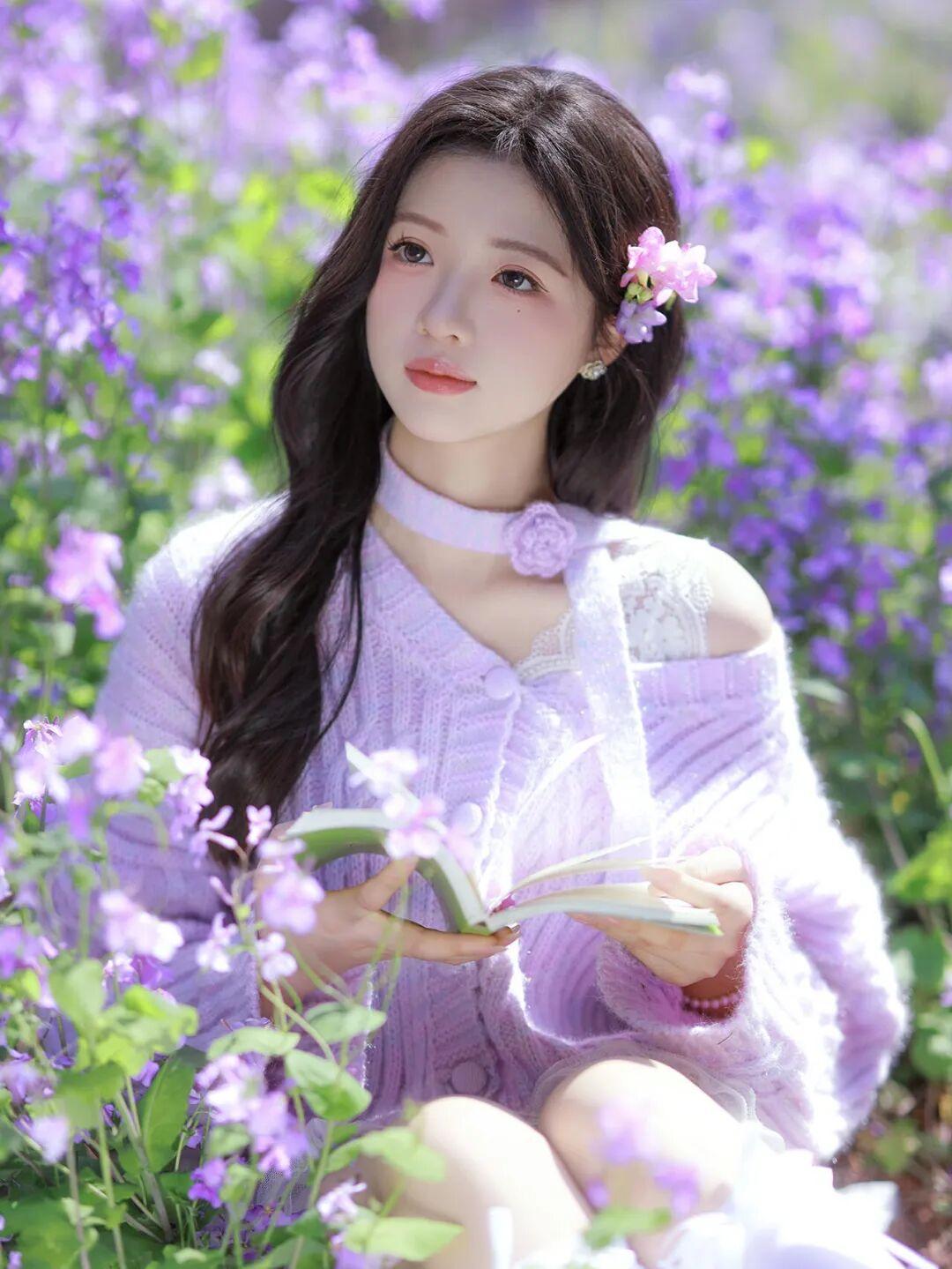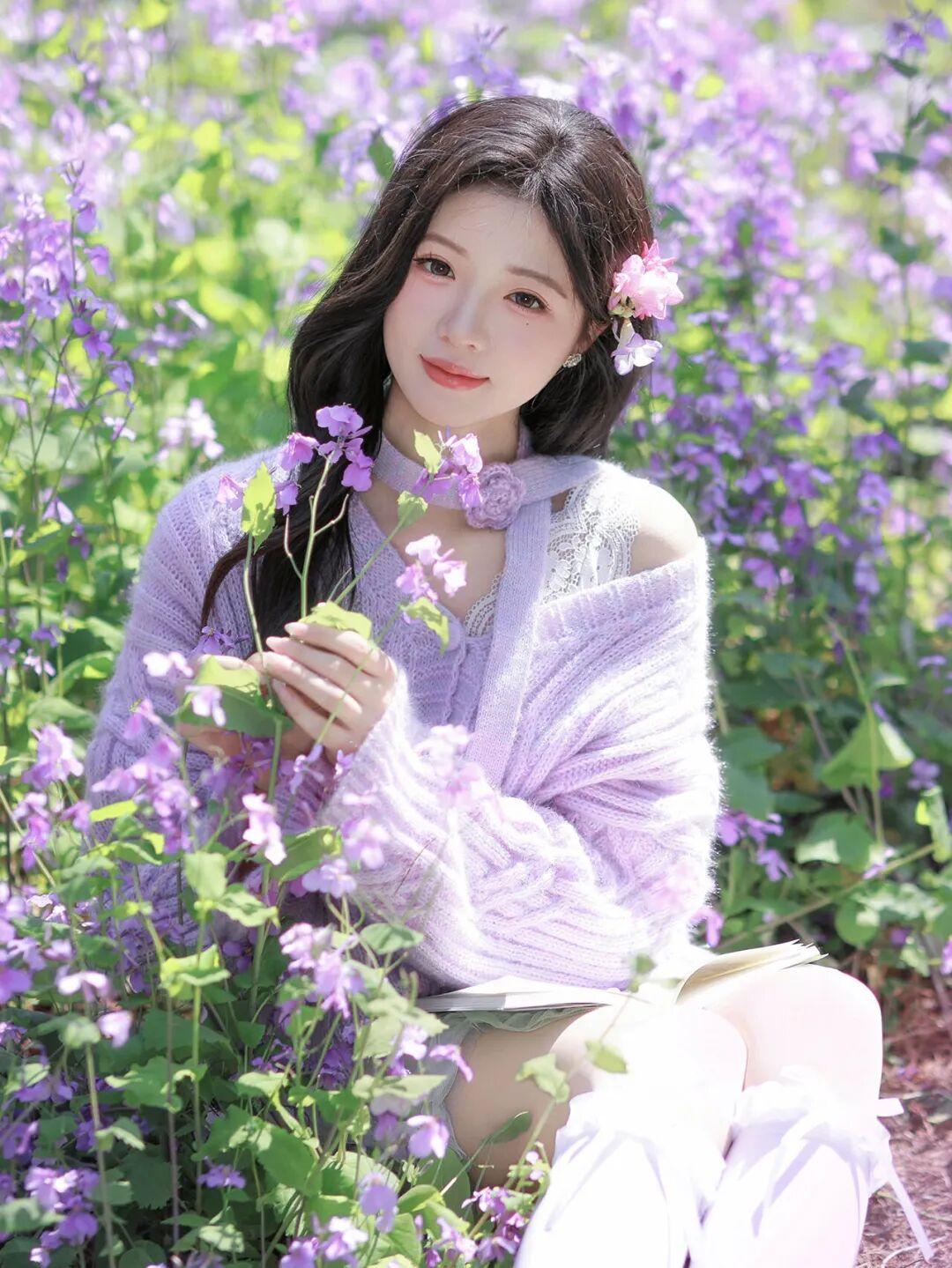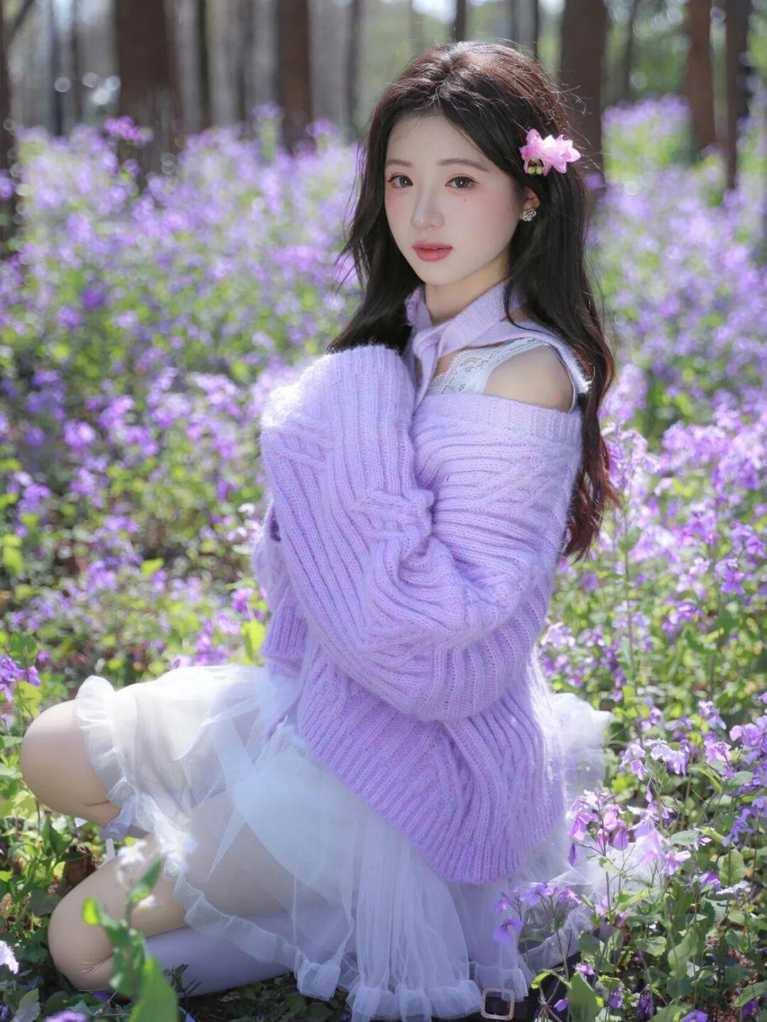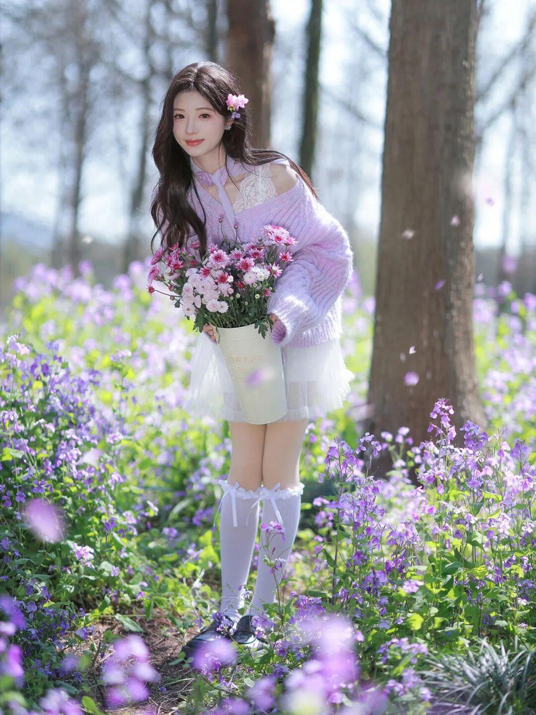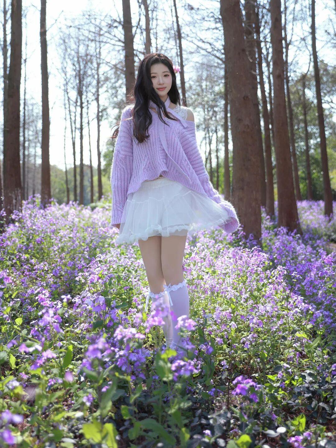 她穿着香芋紫宽松针织开衫,柔软的纹理带着慵懒感,内搭白色蕾丝小衫,露出一侧肩头,甜而不媚;下身是轻盈的白色纱裙,搭配同色系带长筒袜,脚踩小皮鞋,清新又减龄。 发丝间别着一朵粉花,颈间系着同色系的玫瑰颈带,妆容清透,眉眼温柔,和漫山遍野的淡紫色花海相映成画。 她时而在花丛中漫步,裙摆轻扬;时而蹲坐或席地而坐,捧着书本阅读,或是轻拈花枝、抬头望向林间阳光,眼神澄澈又带着笑意。 阳光透过高大的水杉树洒下斑驳光影,朦胧的紫花前景让画面更添梦幻感,整体色调柔和,像把整个春天的温柔都揉进了镜头里。