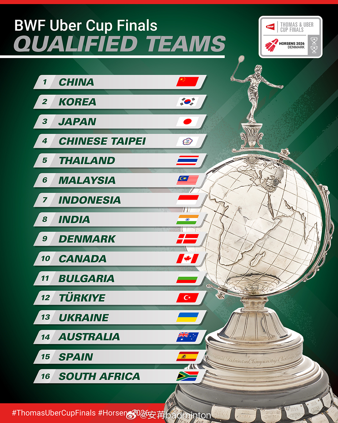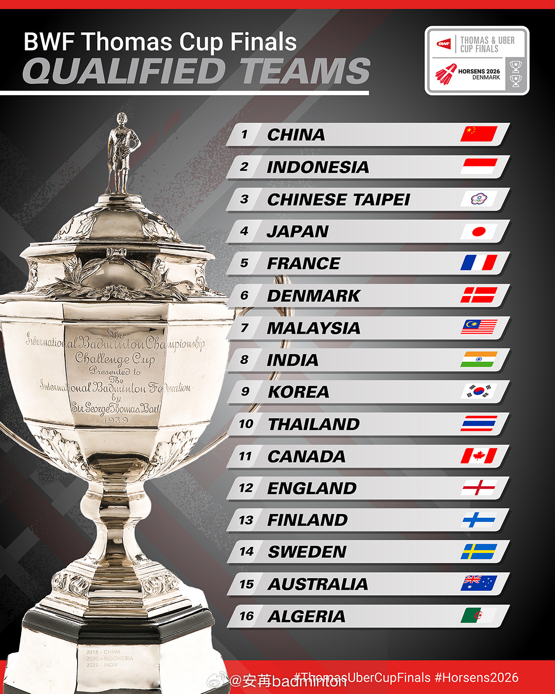 2026年汤尤杯最终参赛参赛队伍&种子全部出炉
