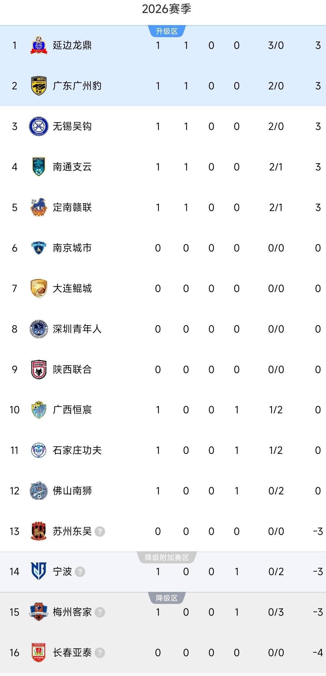 中甲最新积分榜出炉! 梅州客家0-3惨败,广州豹2-0开门红! 北京时间3月14日,中甲联赛第一轮的角逐打响。 ①无锡吴钩2-0佛山南狮。 无锡吴钩主场作战占据优势局面,第26分钟唐瑞抓住门将出击吊射空门首开纪录,稳扎稳打,第57分钟角球配合勾俊晨头球破门扩大比分,此后防守端严阵以待,没给佛山任何的破绽。 ②广东广州豹2-0宁波。 比赛第23分钟卡马拉禁区被犯规获得点球,尼康主罚命中,广州豹打破平衡,接着队伍乘胜追击,上半场补时图多列进球扩大优势。落后的宁波奋起追赶,制造一定威胁,但破门乏力。 ③南通支云2-1石家庄功夫。 两队上半场的苦战交白卷,下半场的争夺是南通率先发力,卡卢卢近距离补射首开纪录,随后角球回合卡尔头球再下一城,短短三分钟两球稳住阵脚。石家庄功夫最后第87分钟比达尔远射扳回一城,可惜为时已晚,无法改变结果。 ④定南赣联2-1广西恒宸。 ⑤梅州客家0-3延边龙鼎。 延边龙鼎来势汹汹,黄振飞先是门前包抄破门,接着内切轰出一脚精彩世界波,两分钟独中两元,这为队伍做好铺垫,进入下半场乔瓦尼建功,他们把胜利牢牢握在手中。梅州客家无可奈何,全力反扑却没有任何建树,首战遭遇0-3惨败。