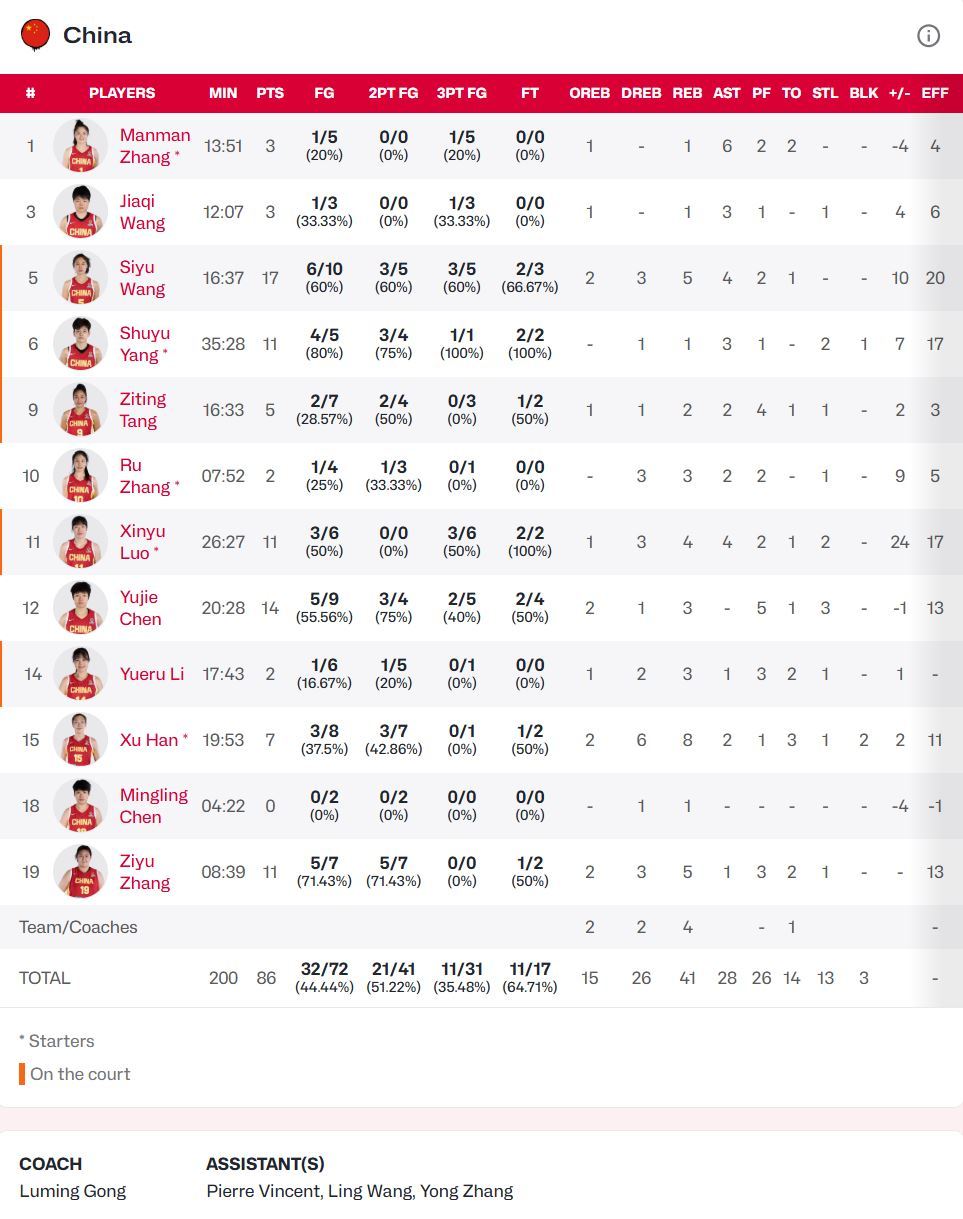 王思雨17分5篮板4助攻,陈玉婕14分3篮板3抢断,罗欣棫11分4篮板4助攻2抢断,杨舒予11分1篮板3助攻2抢断1盖帽,张子宇11分5篮板1助攻1抢断,韩旭7分8篮板2助攻1抢断2盖帽。