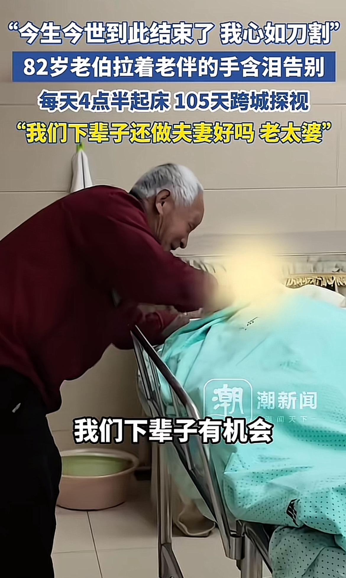 3月13日,浙江宁波李惠利医院里,82岁的陈老伯含泪与老伴薛阿姨告别。从去年11月底起,为了探视因脑梗并发症住院的老伴,他每天清晨4点半起床,从舟山市金塘镇出发辗转奔波去宁波,105天从未间断。为赶最便宜的班车,老伯早出晚归,只为每天半小时的探视。医护人员被他的坚持打动,还特意调整探视时间。可惜最终还是没能挽回薛阿姨的生命。“今生今世到此结束了,我心如刀割”,陈老伯的话让人动容。这份跨越105天的深情,真的太感人了。