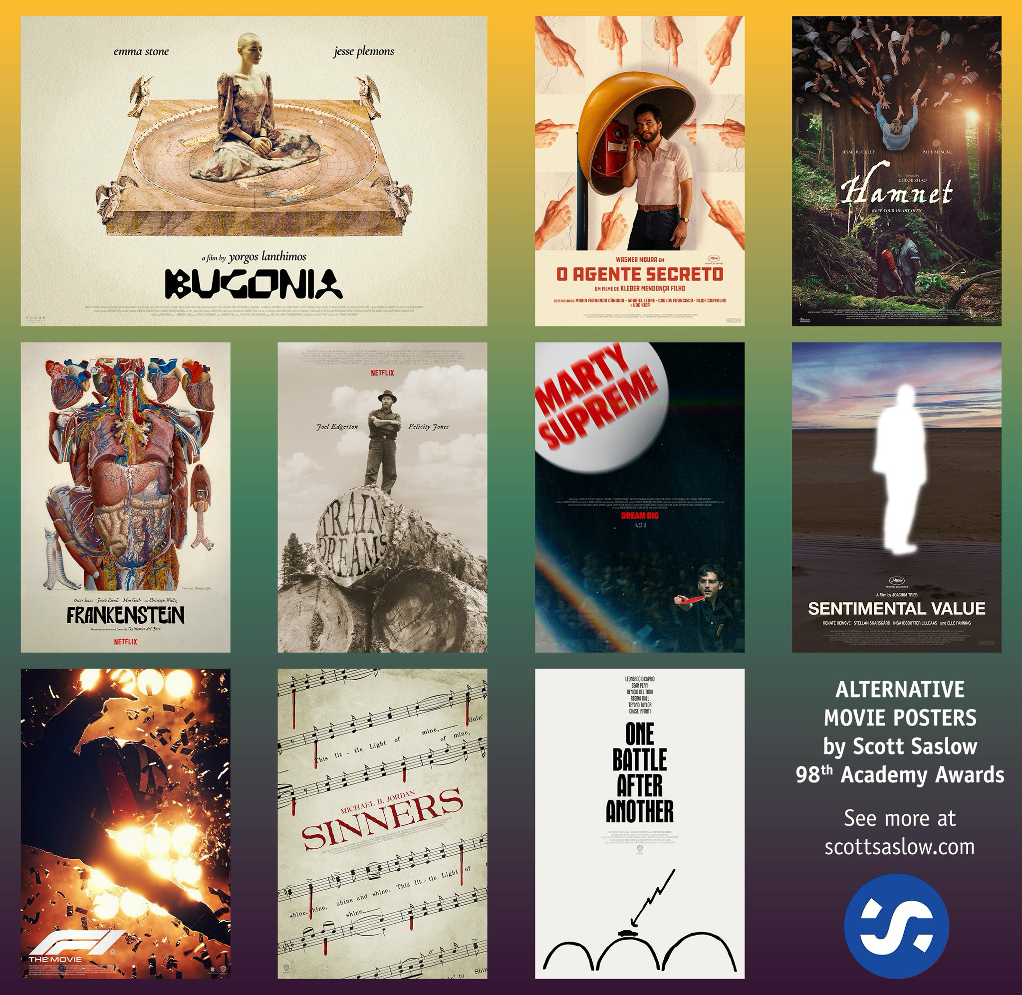 奥斯卡提名影片艺术海报第九弹!画师Scott Saslow为第98届奥斯卡最佳影片10部入围影片创作艺术海报大赏!谁会笑到最后?坐等周一早7点开始!最佳影片提名:《暴蜂尼亚》《F1:狂飙飞车》《科学怪人》《哈姆奈特》《至尊马蒂》《一战再战》《密探》《情感价值》《罪人》《火车梦》