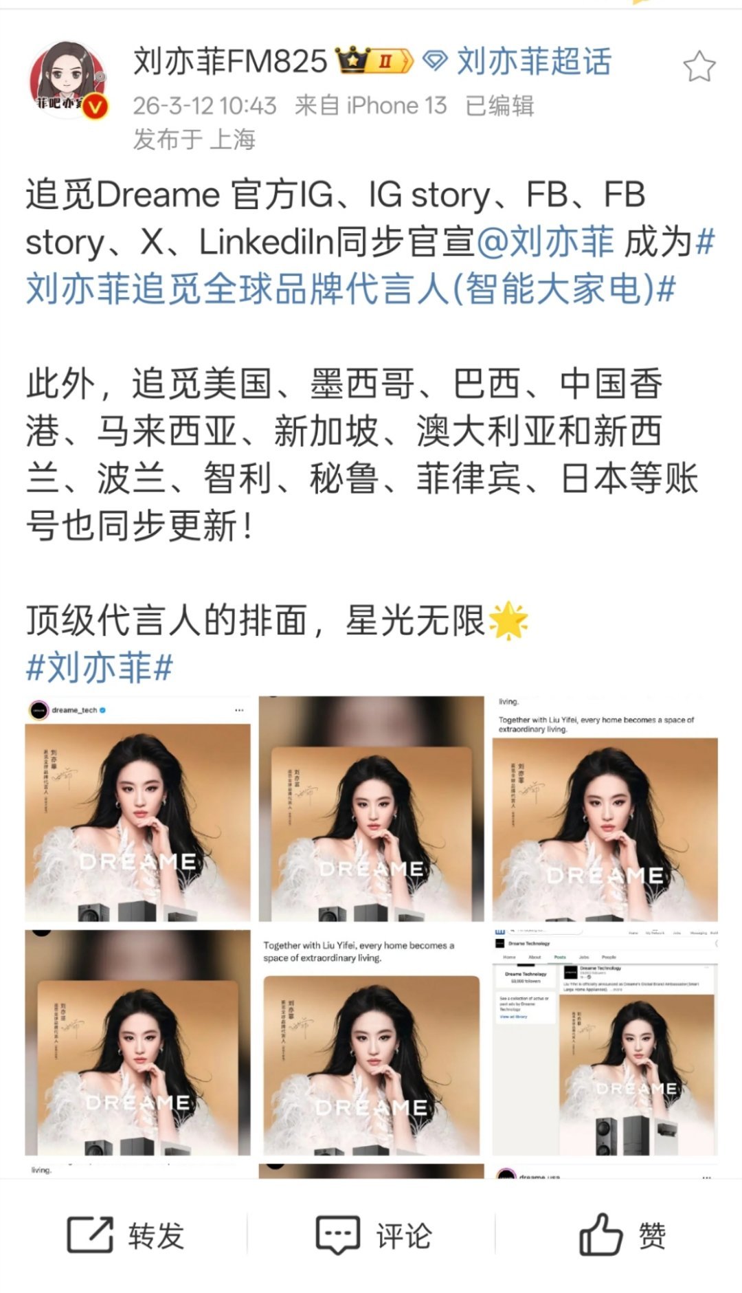 四大洲官宣,美洲,亚洲,欧洲,大洋洲,就看非洲有没有。美洲国家真多,追觅海外市场那么牛吗,还有拿刘亦菲140周年高珠广告官宣哈哈