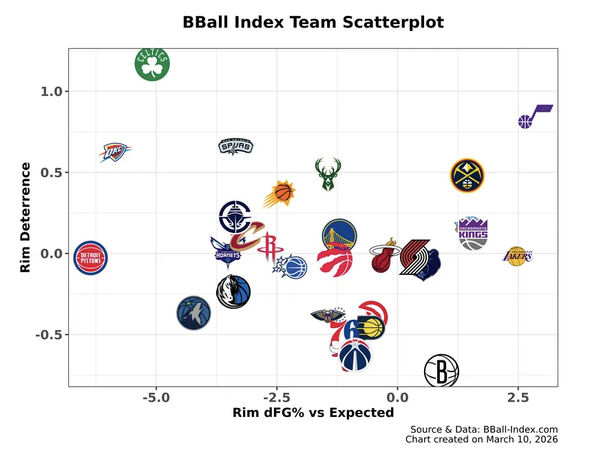 以下是球队护框威慑力与护框质量的统计:⬆️纵轴向上:迫使对手减少篮下出手⬅️