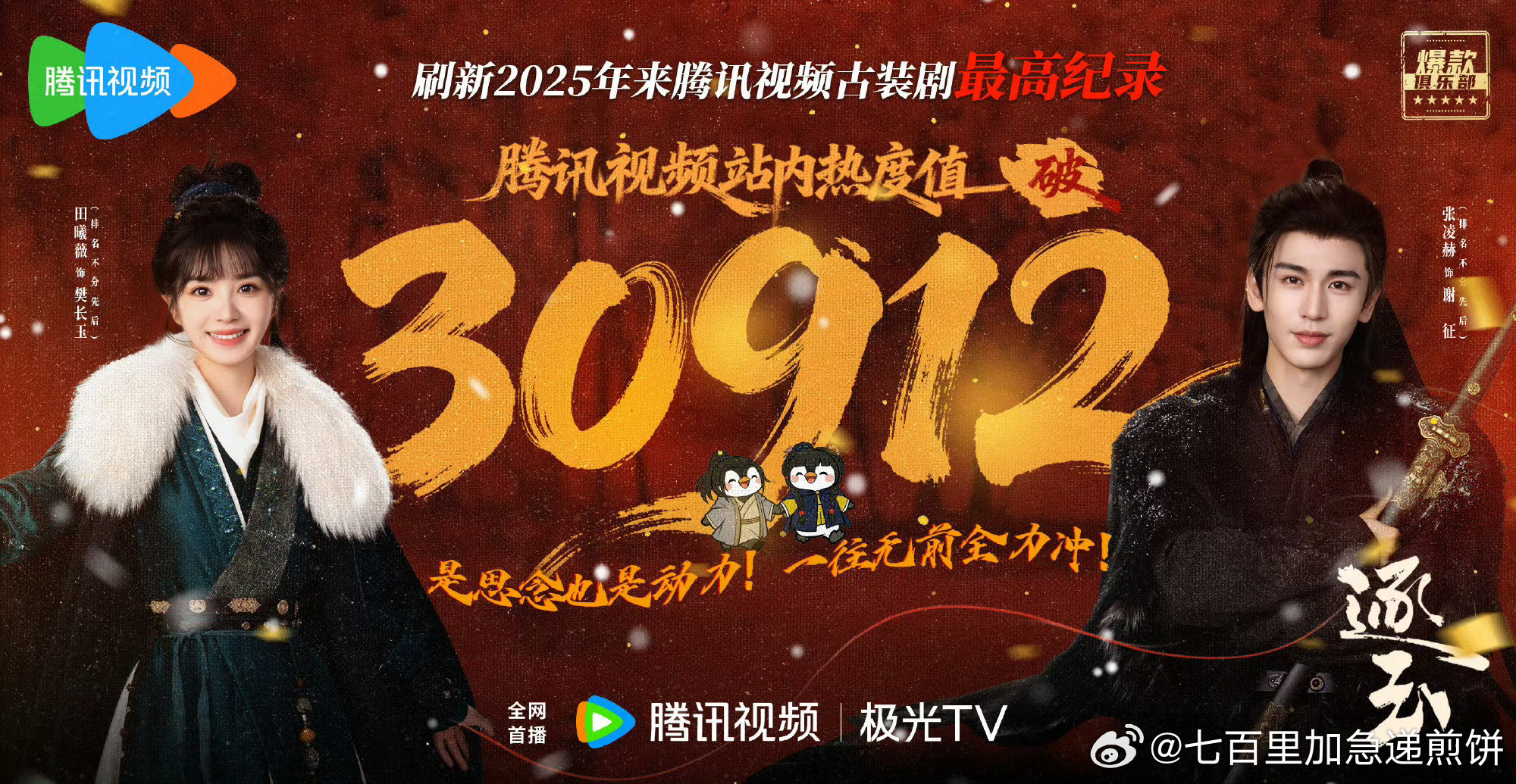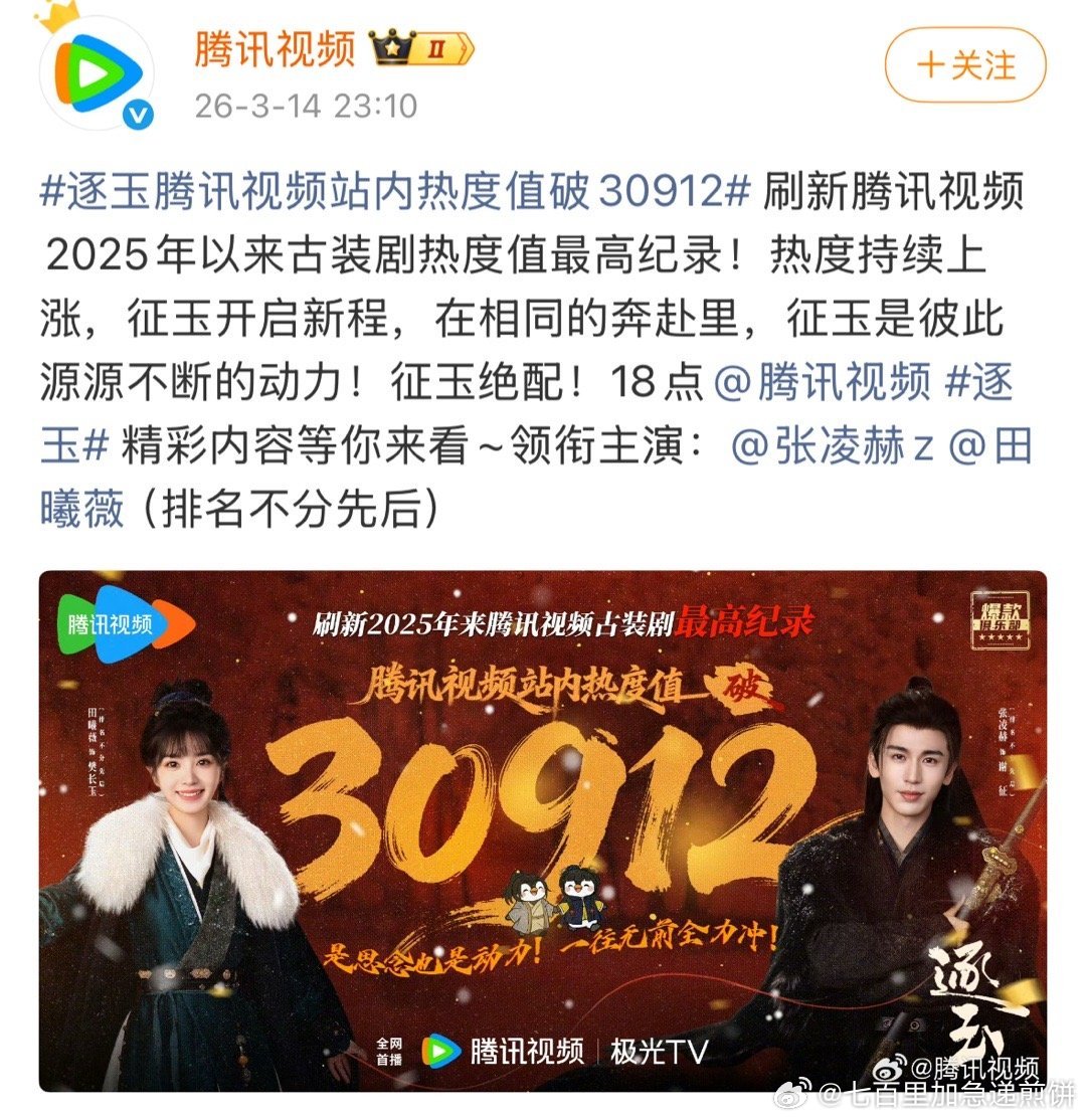 《逐玉》腾讯视频热度破30912,刷新2025年来古装剧最高纪录。
