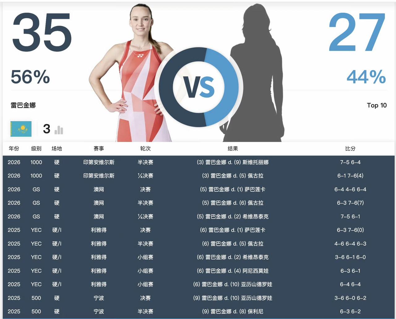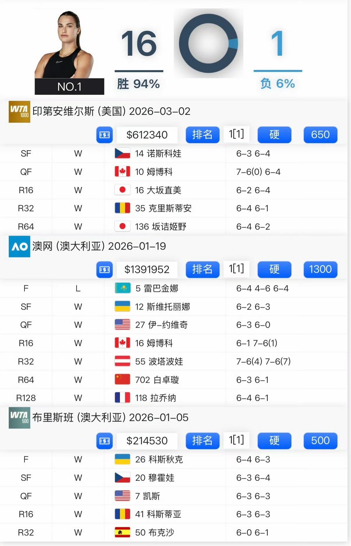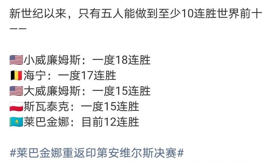 进入IW女单决赛的两个人都强得离谱,谁能夺冠? 萨巴今年打了17场球,16场都是直落两盘胜出,唯一的例外就是澳网决赛。 新世纪以来,只有五人能做到至少10连胜世界前十,莱巴金娜目前是12连胜。