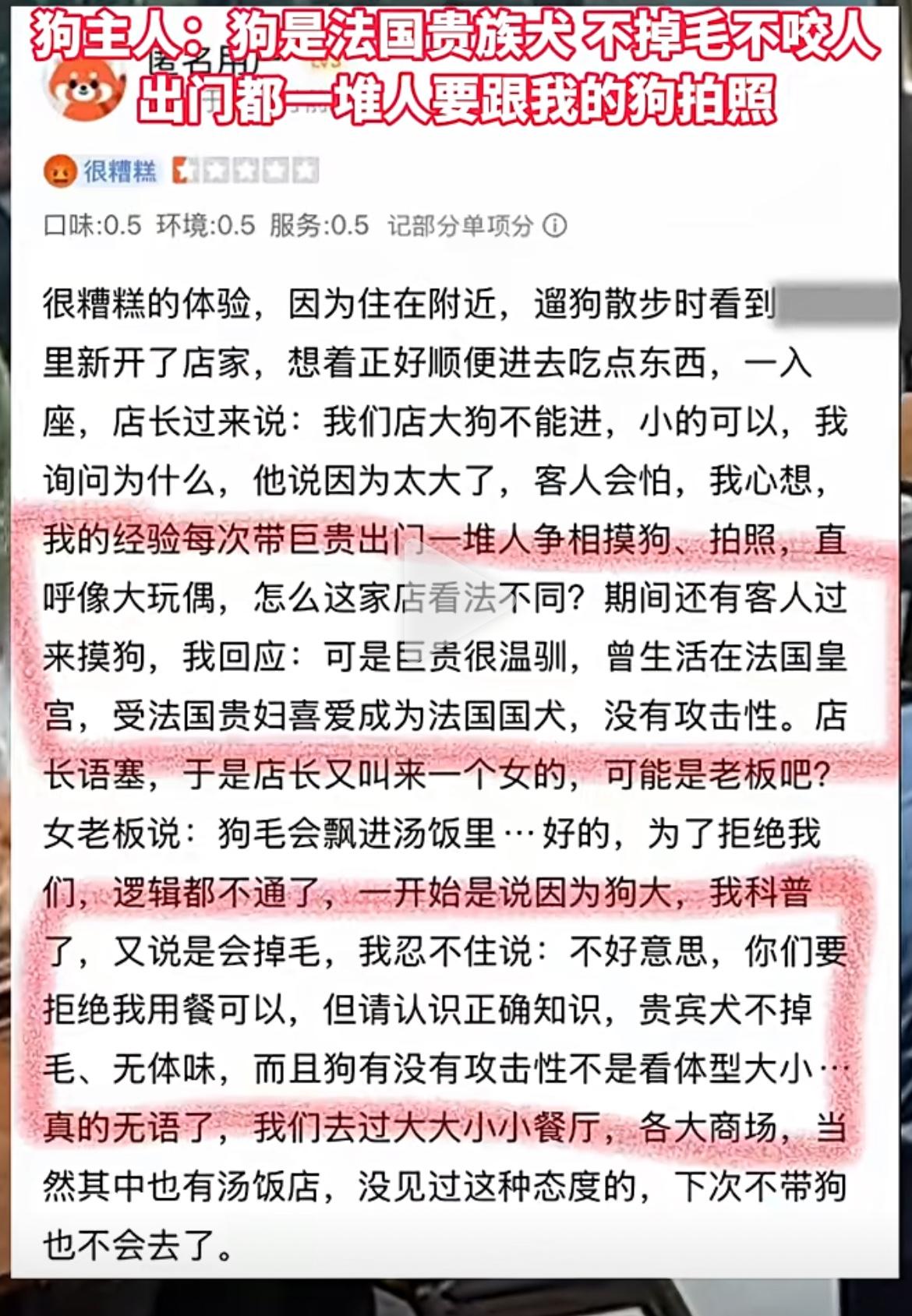 “我的狗是法国贵族犬”女子带着两只狗准备进餐厅用餐,店长看到后,当心吓到客人,于是委婉地都说小狗可以进,但是大狗不能进。女子回应狗狗是法国贵族犬,特别招人喜欢没有什么攻击性 但是老板还是以狗毛会不小心飘到汤为由,拒绝了她的用餐,于是女子就写了一篇长长的差评批判商家 我觉得商家的做法没有问题,买卖自由,商家有选择顾客的权利。而且有些人特别不怕狗狗,而且是这种比较大型的狗,不管是法国的还是国产的,不让进也很正常 你们觉得商家的做法对吗?说说你的看法。
