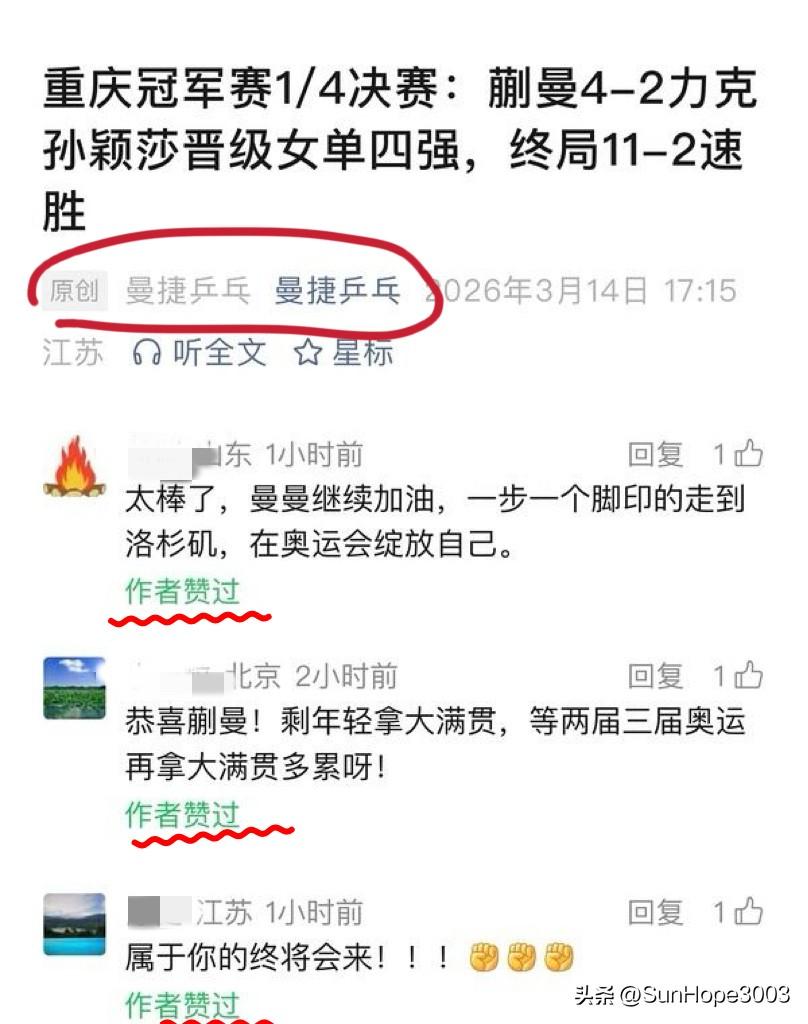 怎么说呢,km看起来不错,但是有这样一个父亲,不知道是好还是坏, 不过不着急,任何事情,只要时间到了自然就有答案。 这大标题,孙颖莎是外协啊,11:2,孙颖莎一个正手体系的人,连反手刀削面都上了, 还在强调分数。 奥运绽放,这样的事情还点赞? 八字还没一撇的事情,作为亲人,还是低调的好,女队冲击很大, 怎么就确定一定可以上奥运呢!