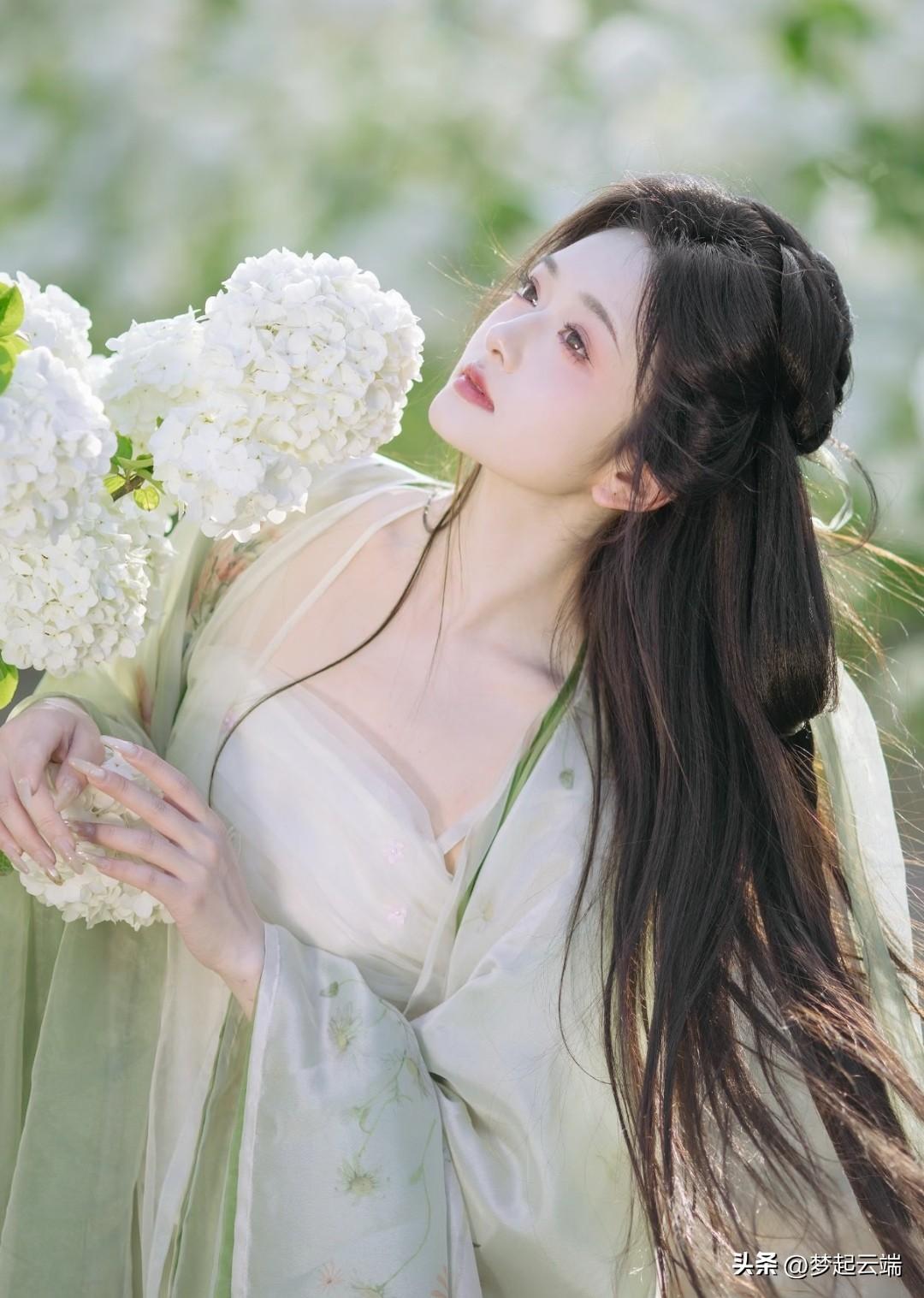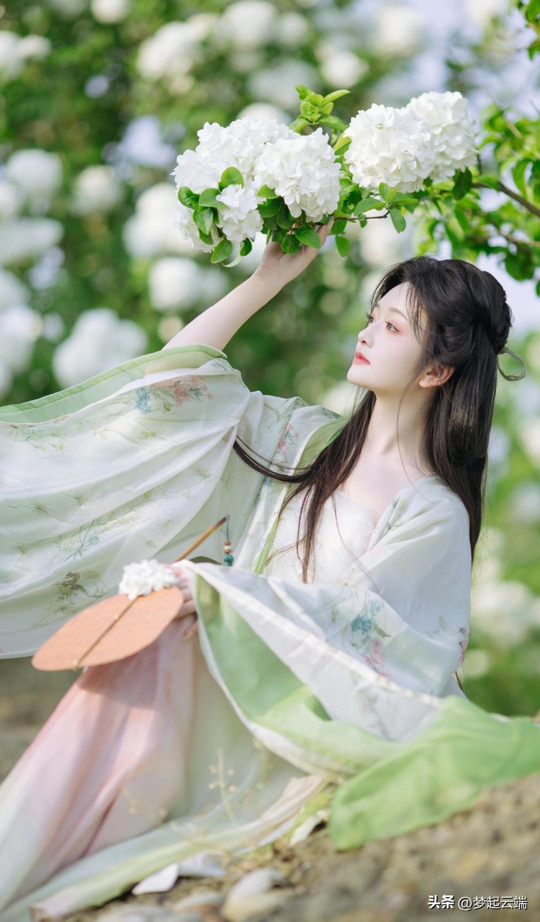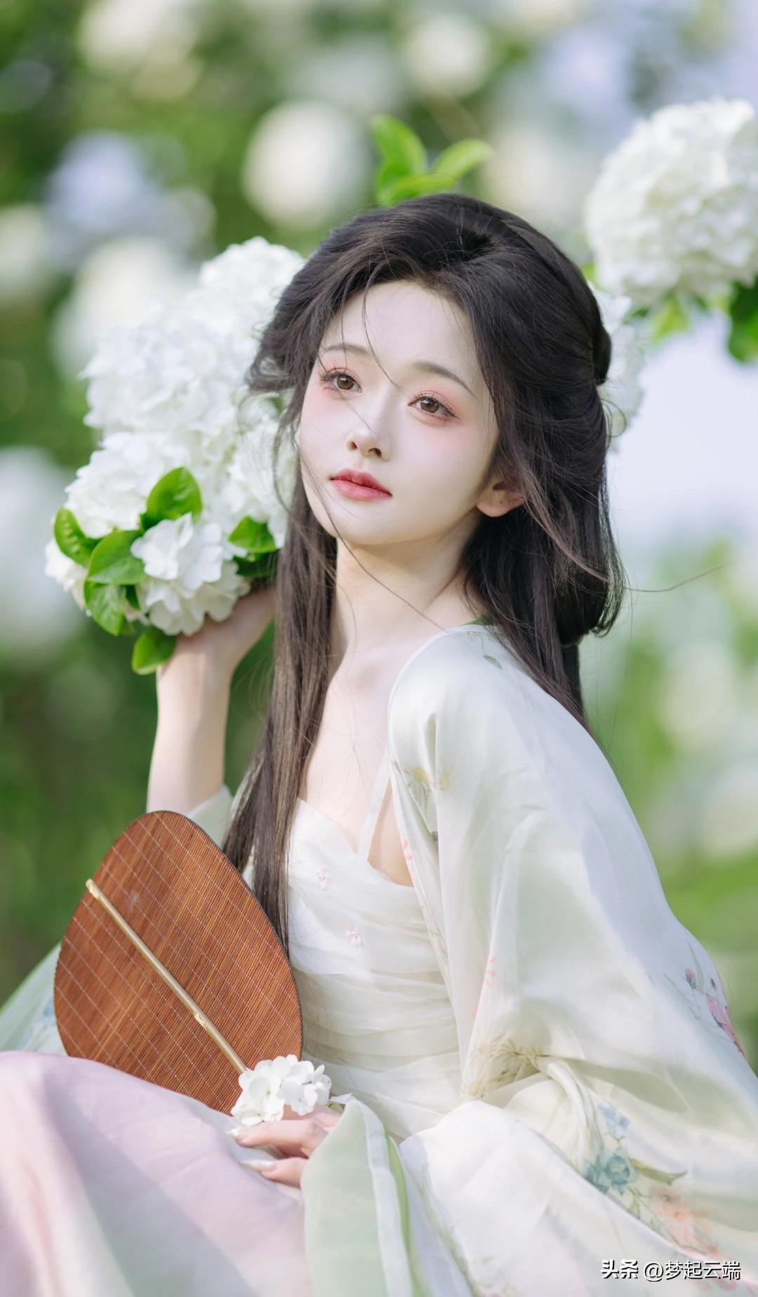 梦幻古风少女,手持团扇,花丛中悠然自得。