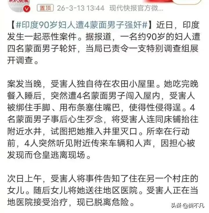印度90岁老妇在自家农田遭4人蹂躏,还被推入水井灭口,警方悬赏抓捕 事情发生在印度某地。 90岁老妇人独居在自家农田边的小屋里。那天晚上,四个蒙面男人闯进来。 惨无人道的对这个颤颤巍巍的90岁老妇人,轮流实施了侵犯。 完事后,他们把她连人带床,往井里推,准备毁尸灭迹。 井有多深不知道,但一个90岁的老人,被推进去,必死无疑。 老天有眼,外面突然传来声响。四个禽兽做贼心虚,扔下她跑了。 老妇人被救起时,已经奄奄一息。 目前她已脱离危险,但身体和心理的创伤,这辈子都好不了。 案发后,当地警方展开搜捕。 但这四个人,至今逍遥法外。 警方发布了悬赏,征集线索。 可谁都知道,在印度,这种案子破起来有多难。 报案不及时、证据难保留、受害者不敢开口、嫌犯躲进村子就没人找得到,太多这种案子,最后都是不了了之。 印度这个国家非常奇葩,印度的强奸案,多到令人可怕。 官方统计,平均每天发生近90起。但这只是报案的,没报案的,不知还有多少。 从8个月大的婴儿,到90岁的老妇,没有年龄下限,也没有上限。 2012年德里公交车轮奸案震惊世界后,印度修改了法律,加重了刑罚,增设了死刑。 但犯罪的人,根本不在乎。 因为他们知道,被抓的概率不高,被判刑的概率更低。 更重要的是,这个社会对女性的态度,骨子里就没变过。 很多人问:印度为什么老出这种事? 有几个原因: 第一,法律执行太弱。 法律写得再严,没人执行就是废纸。警察不作为、法院判得慢、证人不敢作证,恶性循环。 第二,受害者不敢开口。 在印度,被强奸的女人,往往比强奸犯更被人看不起。家人嫌丢人,村里人说闲话,甚至有人逼受害者嫁给强奸犯。 开口告发,等于公开处刑自己。 第三,男权文化根深蒂固。 在很多印度男人眼里,女人就是附属品。她们没有权利,没有尊严,被侵犯是因为“穿了不该穿的衣服”“晚上不该出门”“活该”。 这种观念不改变,法律再严也没用。 90岁,四个蒙面人,连人带床推入井。 这些词放在一起,根本不该出现在任何一条新闻里。 但它就是发生了。 而且,那四个禽兽还在逃。 我不知道印度三哥的警方能不能抓到他们。 但我知道,就算抓到了,在印度这种事也不会停止。 因为真正可怕的,不是那几个犯罪的人。 是印度这个让犯罪者觉得理所当然的社会。 什么时候印度女人能安全地走在路上? 什么时候90岁的老妇人能安心地睡在自己的床上? 答案,可能还要等很久。 你怎么看这种事?评论区聊聊。