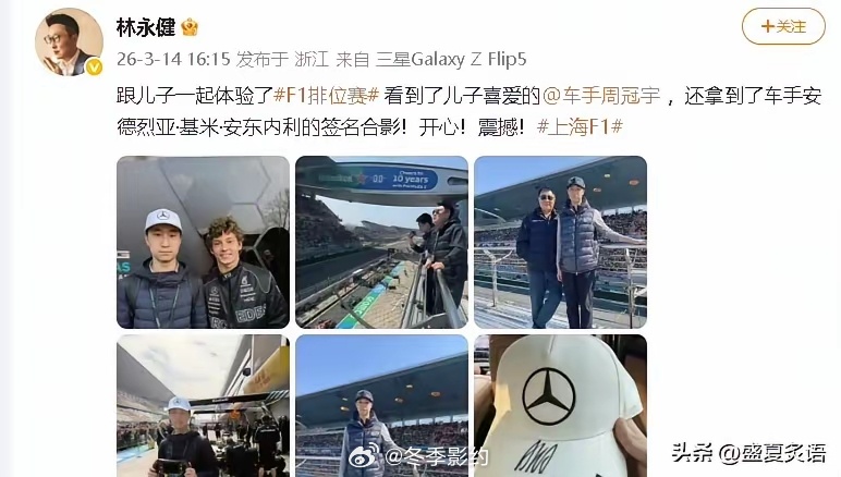 林永健,高调发文!3月14日,一向低调的林永健,突然在社交平台激动发文,字里行间是兴奋和难以抑制的激动,这到底是怎么回事呢?原来,林永健晒出带儿子林大竣,现身上海F1排位赛的动态。瞬间勾起网友回忆,当年那个在《爸爸去哪儿》里皱着小眉头的“小老头”,如今已经长成了比爸爸还高的半大少年。这次观赛对林大竣来说更是圆梦时刻——他不仅见到了喜爱的中国车手周冠宇,还和梅赛德斯青训车手安德烈亚·基米·安东内利合影,拿到了对方的签名帽。林永健配文里满是“开心”“震撼”,字里行间都是陪儿子追星的满足。从《爸爸去哪儿》里的调皮萌娃,到如今身高超过爸爸的少年,林大竣的成长轨迹一直被网友关注。这次F1赛场同框,不仅让大家看到了父子间的温馨陪伴,更直观感受到了时光的魔力:曾经黏在爸爸身边的小不点,已经长成了能并肩看世界的少年。